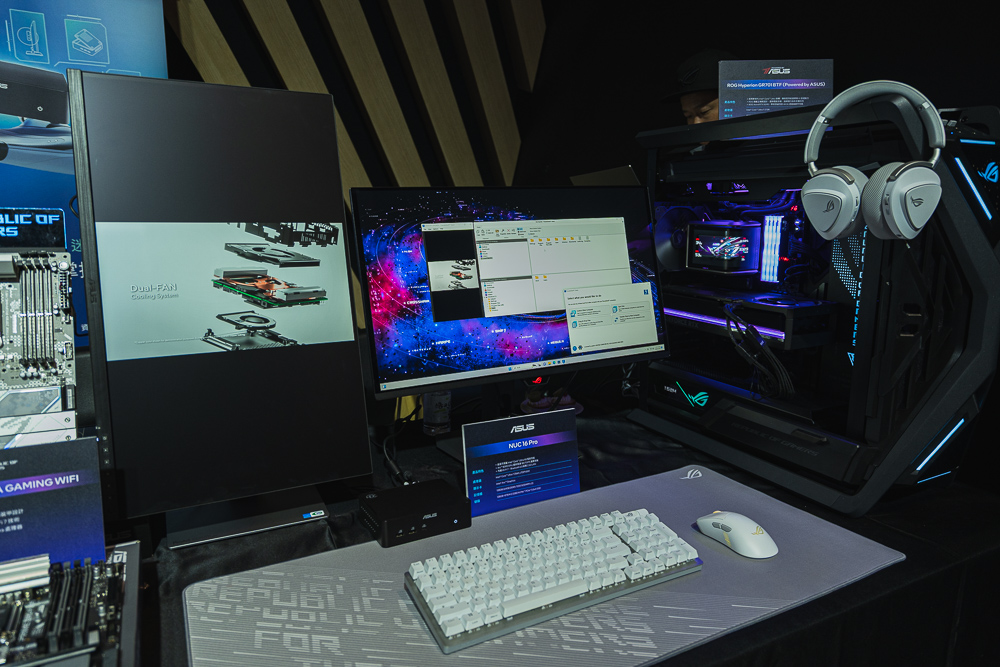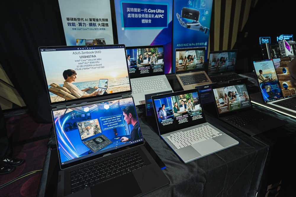筆電方面,則有獨特的雙螢幕輕薄筆電 Zenbook Duo UX8407AA,以及 Zenbook S UX5406AA、Vivobook S S3607AA、Vivobook X1407AA/X1607AA,以及電競款的 Zephyrus Duo GX651AX、Zephyrus GU606AX、Zephyrus GU405AR 與迷你主機 NUC 16 Pro。