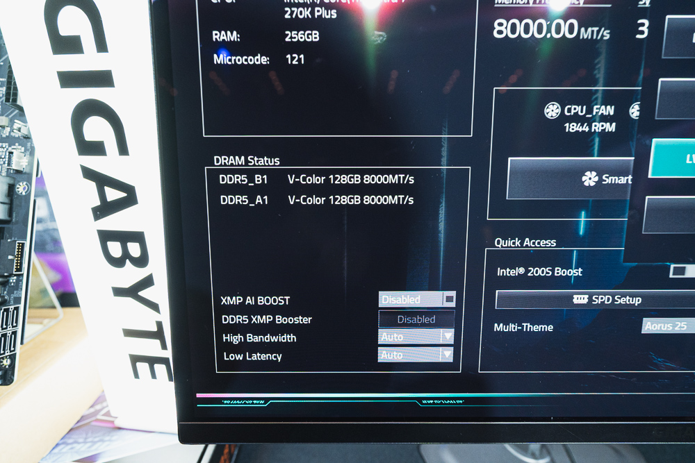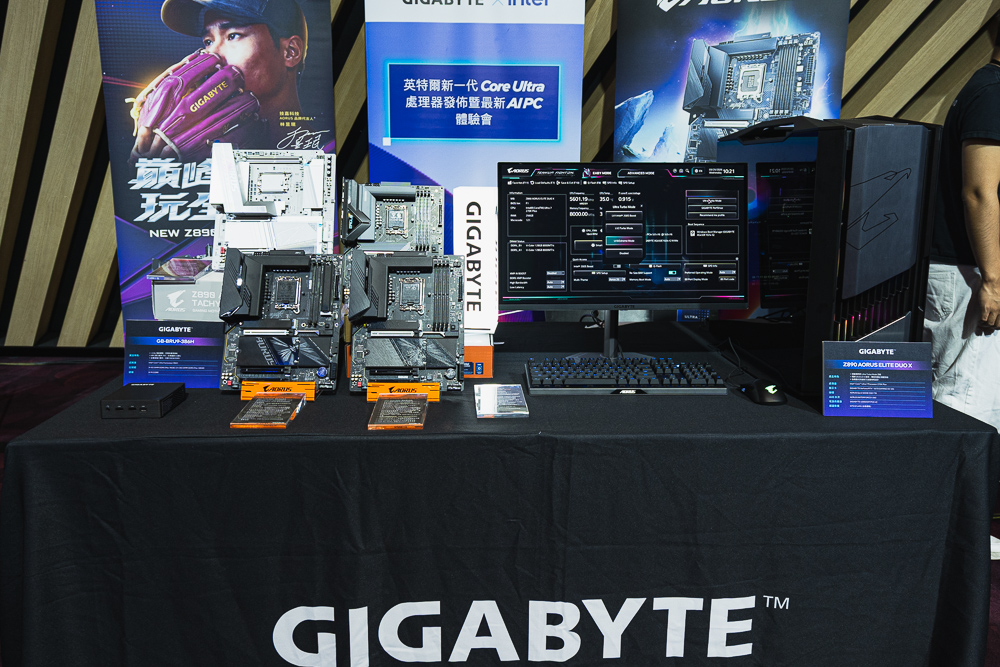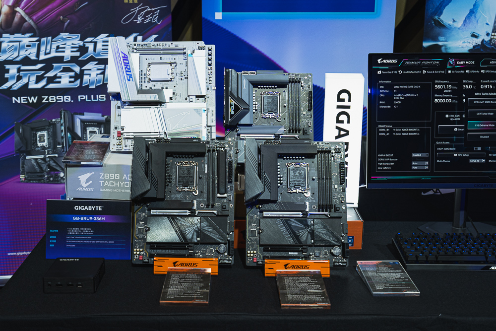 活動現場技嘉展示新一代 Z890 主機板 Z890 AORUS ELITE DUO X,以及迷你 PC GB-BRU9-386H。此外現場的 DEMO 機器,更展示 Ultra Turbo Mode 獨家超頻技術,以及 2 根 DDR5 CQDIMM 8000MT/s 128GB 記憶體。