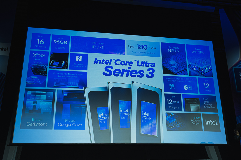 Core Ultra 系列 3 配備最高 12 個 Xe 核心的新一代 Intel Arc GPU,平台運算效能最高可達 180 TOPS。該系列亦為首款採用 Intel 18A 製程的行動處理器平台,導入全新 RibbonFET 電晶體架構與 PowerVia 晶片背部供電技術。此外,透過英特爾的先進封裝與 3D 晶片堆疊技術 Foveros,可將多個晶片模組整合於單一 SoC 中,進而在系統層面提供更高的靈活性、可擴充性與效能。