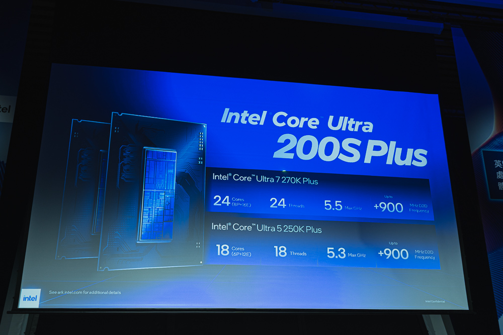 Core Ultra 200S Plus 系列包含高達 24 核心的 Core Ultra 7 270K Plus,以及高達 18 核心的 Core Ultra 5 250K/KF Plus。相較於前一代產品,該系列不僅提供較多核心、晶粒間互連(die-to-die)頻率提升達 900 MHz,多執行緒效能更比同級處理器提升高達 103%。此外,支援 DDR5 7200 MT/s 記憶體,與 Core Ultra 200S Boost BIOS 設定檔相容,並為其 8,000 MT/s 記憶體超頻提供保固支援;部分產品更搶先預覽支援 4-Rank CUDIMM 記憶體,帶來低延遲與高頻寬效益。