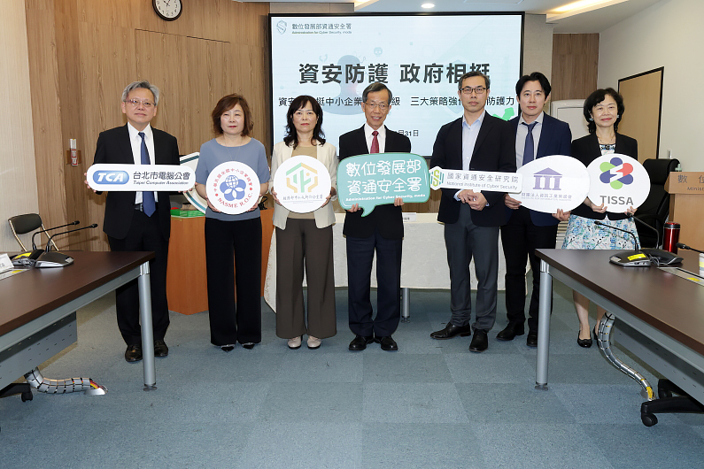 (左起)台北市電腦公會理事洪偉淦、全國中小企業總會秘書長林芬岑、經濟部中小及新創企業署副組長施麗麗、數發部資安署署長蔡福隆、國家資通安全研究院副院長林志堯、資訊工業策進會所長李榮三、中華軟體公會秘書長詹麗淑。