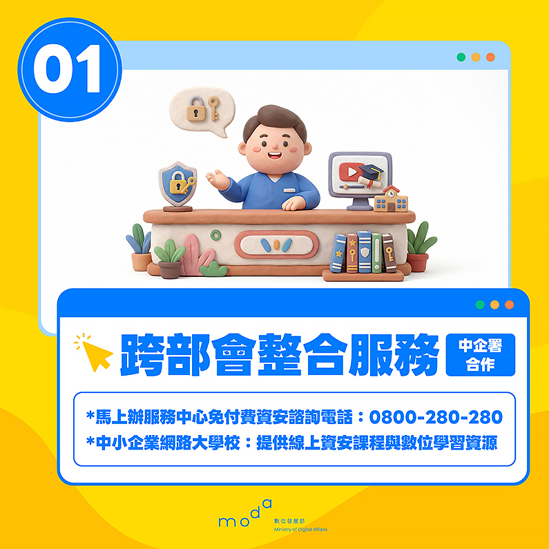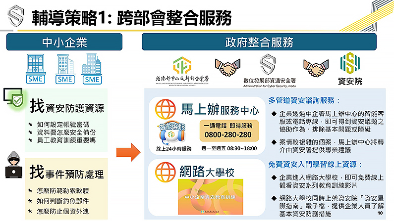 「跨部會整合服務」部分,資安署與經濟部中小及新創企業署合作,於「馬上辦服務中心」提供資安諮詢服務,企業僅需撥打免付費專線 0800-280-280,或透過24小時線上智慧客服即可獲取資安協助、排除基本問題,服務自二月上線至今已突破上百次諮詢量。另外為了提升企業內部資安意識,資安署還同步於「中小企業網路大學校」網站提供許多線上學習資源,包含資安教育訓練影片及「資安星際指南」電子書,讓企業能隨時隨地免費獲取基礎資安防護知識。