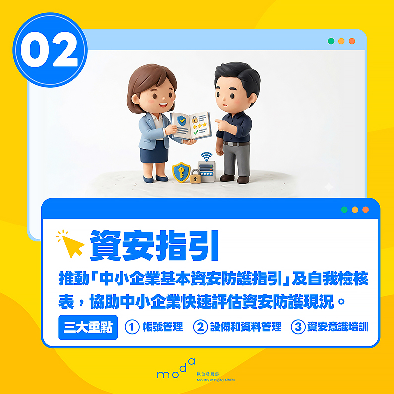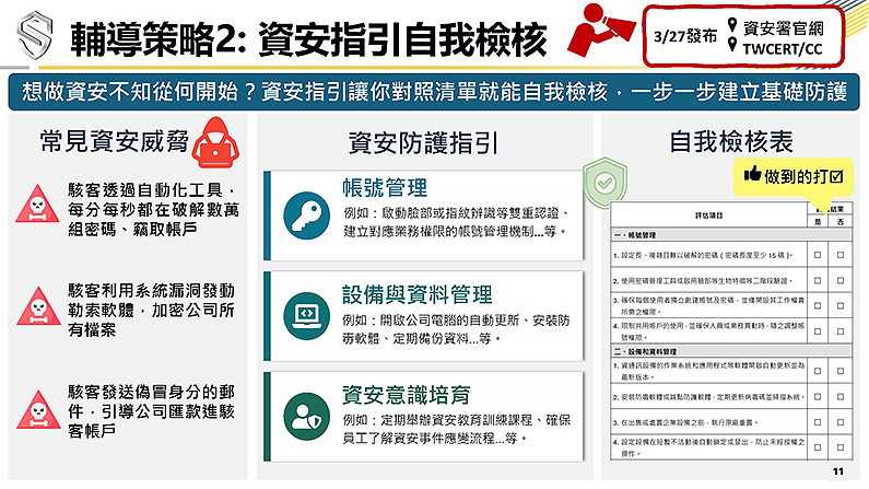 資安指引「企業自我檢核資安現況」部分,資安署參考國際相關資安要求,日前已於資安署網站及台灣電腦網路危機處理暨協調中心(TWCERT/CC)公布適用於我國的「中小企業基本資安防護指引」及自檢表,將專業的資安要求轉化為明確易懂的清單。內容涵蓋帳號管理、設備管理及資料備份等實務建議,例如啟用生物特徵二階段驗證,落實資料保留三份、儲存於二種媒介、一份異地存放的「3-2-1備份原則」等,讓中小企業透過自檢表循序漸進地建立資安基本防護。