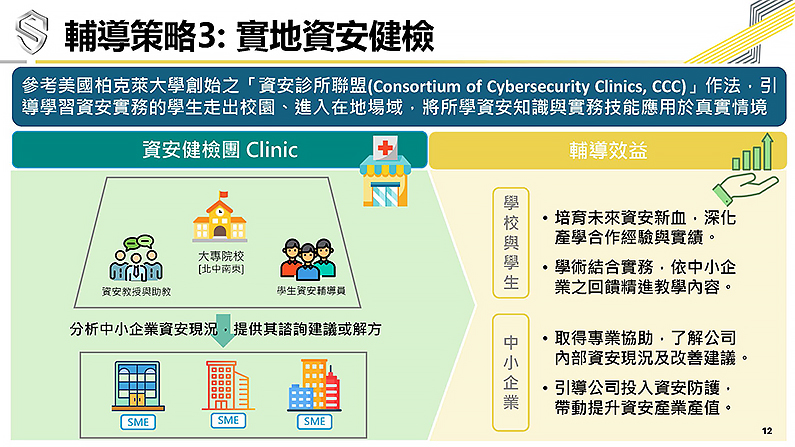 至於「實地資安健檢」部分,資安署將資安能量扎根校園並走入企業,此部分委由國家資通安全研究院補助大專院校資安領域教師開設實務型資安課程,學生先接受訓練再組成「資安健檢團」投入實地服務,深入了解中小企業運作現況並提供資安改善建議。