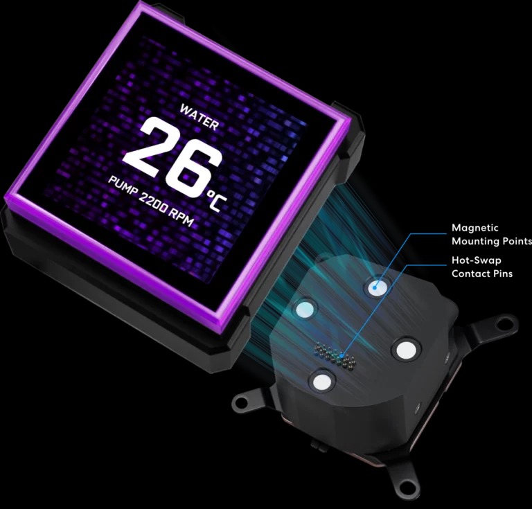 HydroShift II LCD-S 採用磁吸固定的 可熱插拔 3.4 吋方形 IPS LCD 螢幕,具備 480×480 高解析度、500 nits 高亮度 與 60Hz 流暢更新率。螢幕透過 pogo-pin 供電並以磁吸方式安裝,整體 免工具、免斷電,操作安全又便利,此設計讓玩家能在系統組裝完成後再安裝螢幕,方便鎖緊水泵固定螺絲,同時避免螢幕於安裝過程中受損。