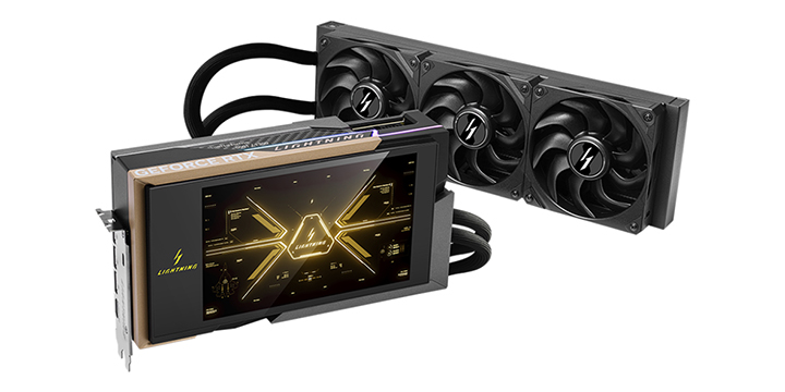 RTX 5090 LIGHTNING Z採用了近乎離譜的規格,配置了40相供電與雙12V-2×6介面,內建360mm水冷排及全球首創8吋螢幕。