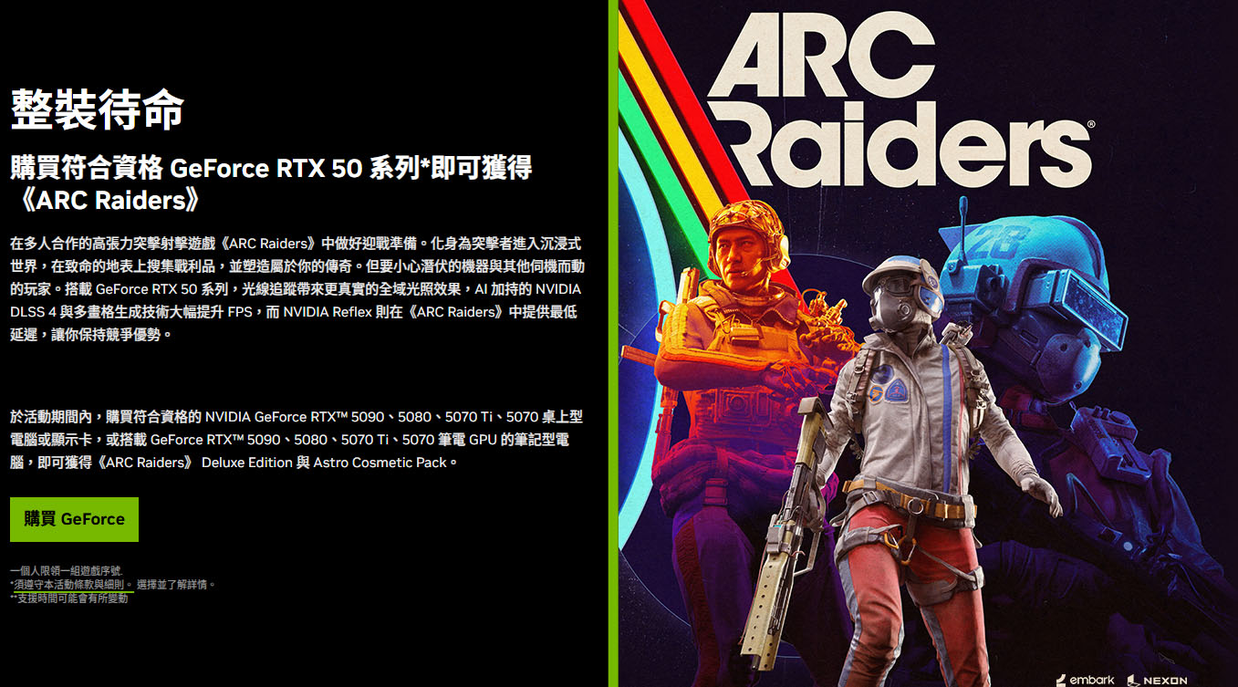 這款由 Embark Studios 打造、緊張又刺激的多人合作、第三人稱射擊撤離冒險遊戲《ARC Raiders》,即將在 10 月 30 日正式推出,同時 NVIDIA 宣佈即日起購買 RTX 50 系列桌上型電腦、顯示卡、筆電等產品,都可獲得《ARC Raiders》 Deluxe Edition 與 Astro Cosmetic Pack。