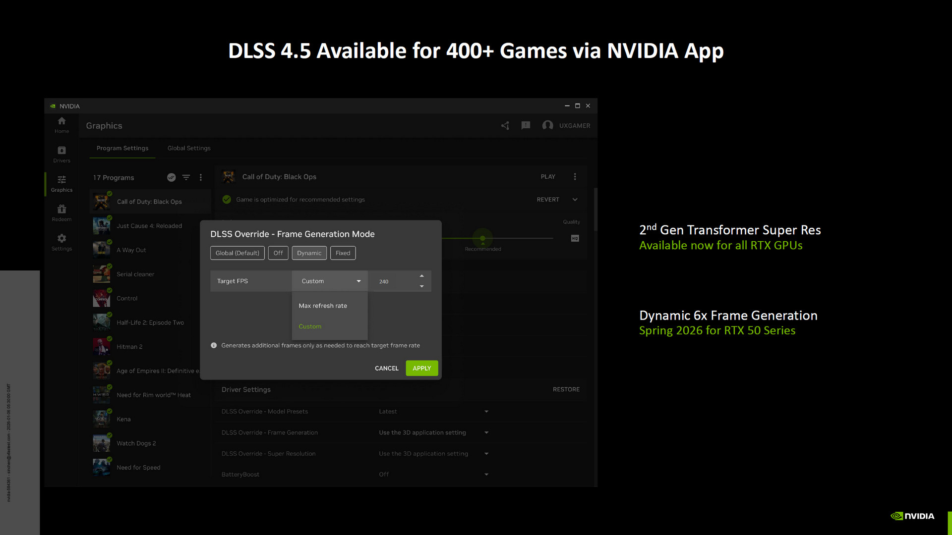 DLSS 4.5 一樣提供 Override 的方式設定,並有著預設、Dynamic 與 Fixed 等選項;上述提到第二代 Super Resolution Transformer 模型對應所有 RTX GPU 開放支援,而動態多畫格生成技術一樣 RTX 50 限定,並預計今年春天登場。