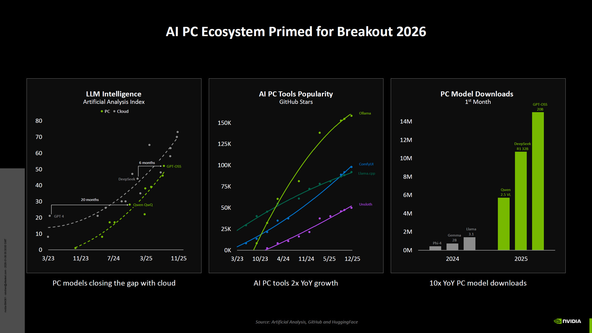 NVIDIA 也分享到 AI PC 的趨勢,首先 PC 端的 LLM 聰明度直線上升,這曲線以相當逼近雲端大型 LLM;而 AI PC 本地端的 AI 工具流行度也在這幾年中倍數提升,尤其是好上手的 Ollanma、ComfyUI 大幅降低 AI 環境部屬門檻;因應前兩個變化,也連帶提升語言模型在 PC 端的下載量。
