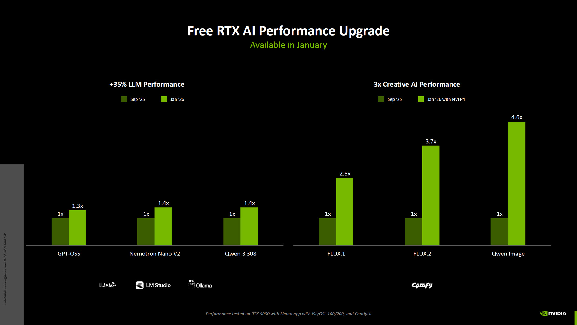 這也是 NVIDIA 一直與各大模型、應用通力合作優化 RTX GPU,不論是 GPT-OSS、Nemotron Nano、Qwen 3 語言模型與 FLUX、Qwen 影像生成模型,藉由對 RTX GPU 最佳化提供 NVFP4 精度,讓 AI PC 能更輕鬆的在本地執行。