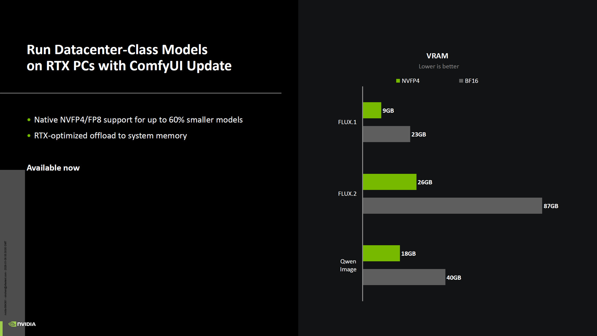 ComfyUI 也將推出更新原生支援 NVFP4/FP8 精度,能夠降低 60% 模型所需的 VRAM 負載量,以及藉由 RTX 優化當 VRAM 不夠時 offload 至系統記憶體。像是 FLUX.2 模型從原本需要 87GB VRAM 降至僅需 26GB VRAM 即可執行。