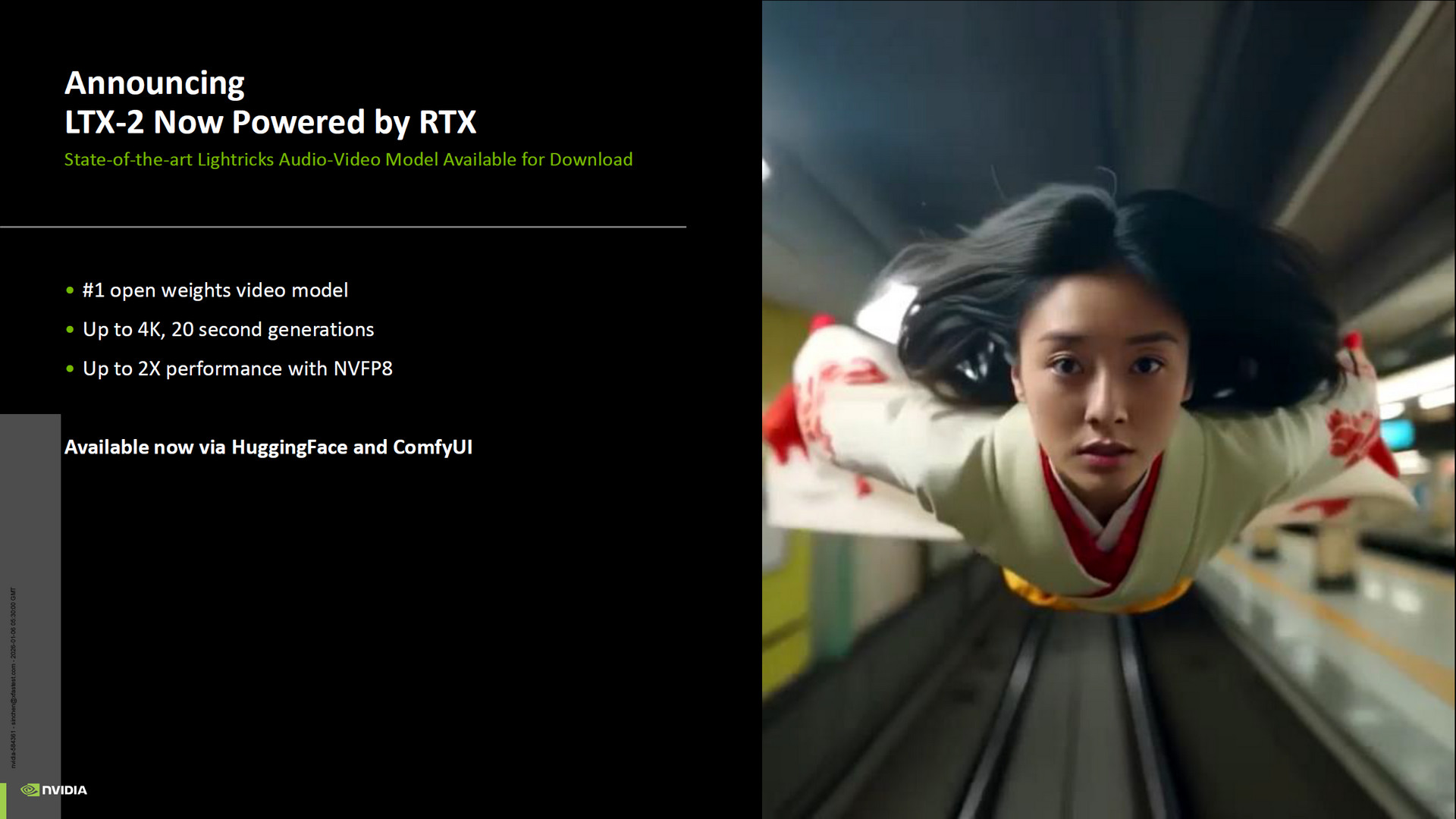 LTX-2 AI 影像生成模型,同樣對 RTX 硬體最佳化支援 4K、20 秒影片生成,以及 NVFP8 精度提升效能,同樣會更新於 HugginfFace 與 ComfyUI。