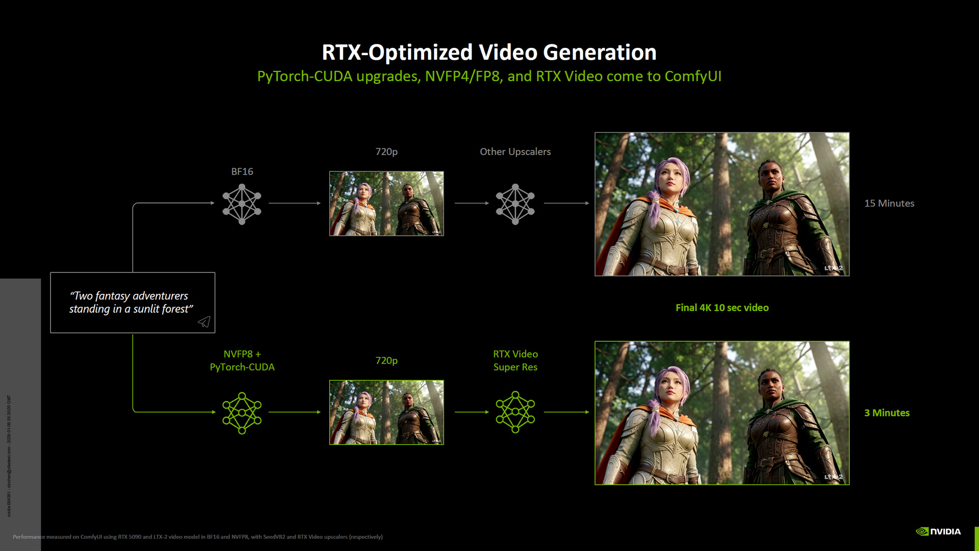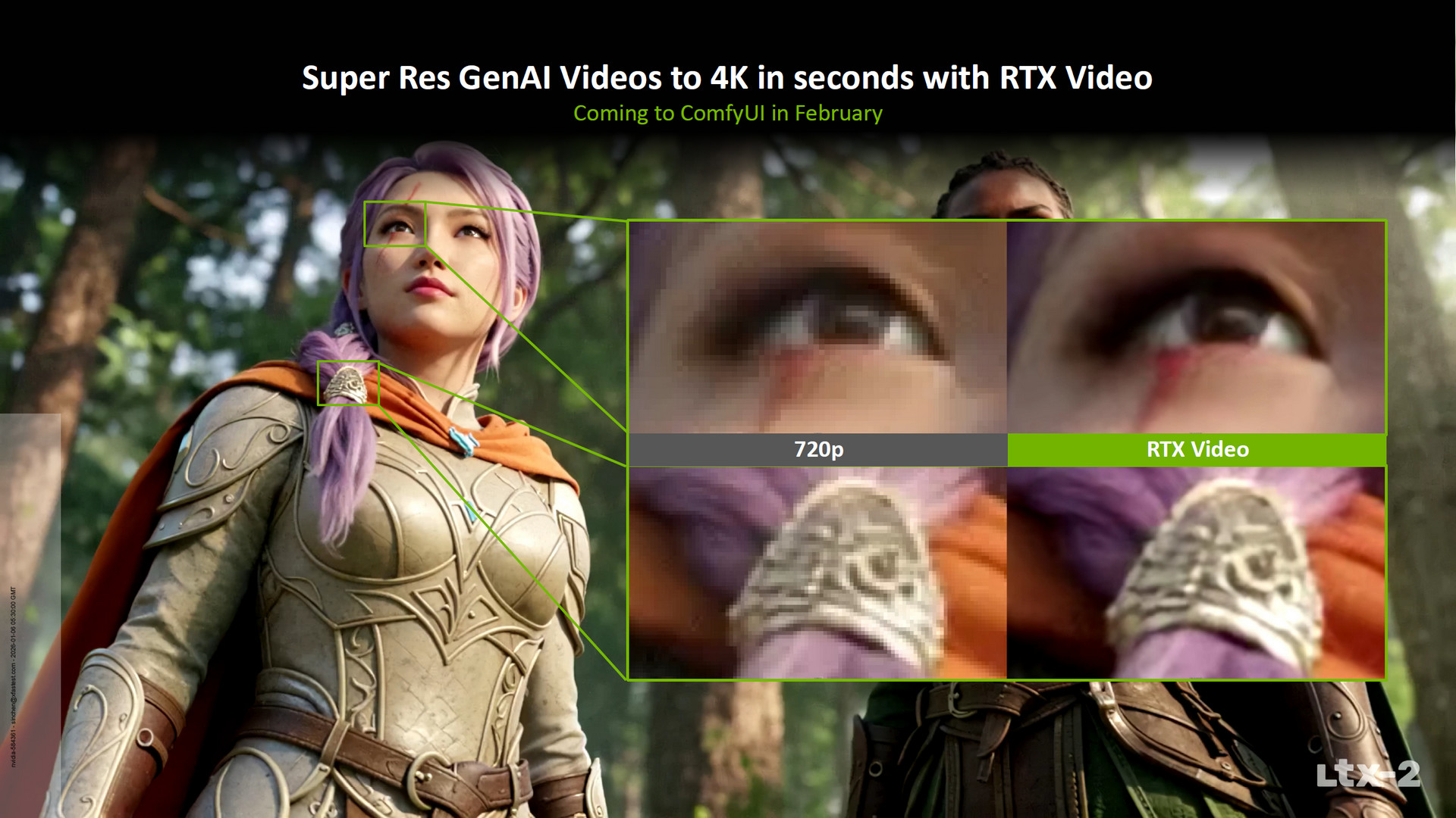 而且 ComfyUI 在 2 月會針對 AI 生成影像提供 RTX Video 的 Super Res GenAI 影像畫質提升技術。將原始生成的 720p 影像,通過 NVFP8 + Pytorch-CUDA 將影像通過 RTX Video Super Res 神經網路,提升成 4K 10 sec 的影像。