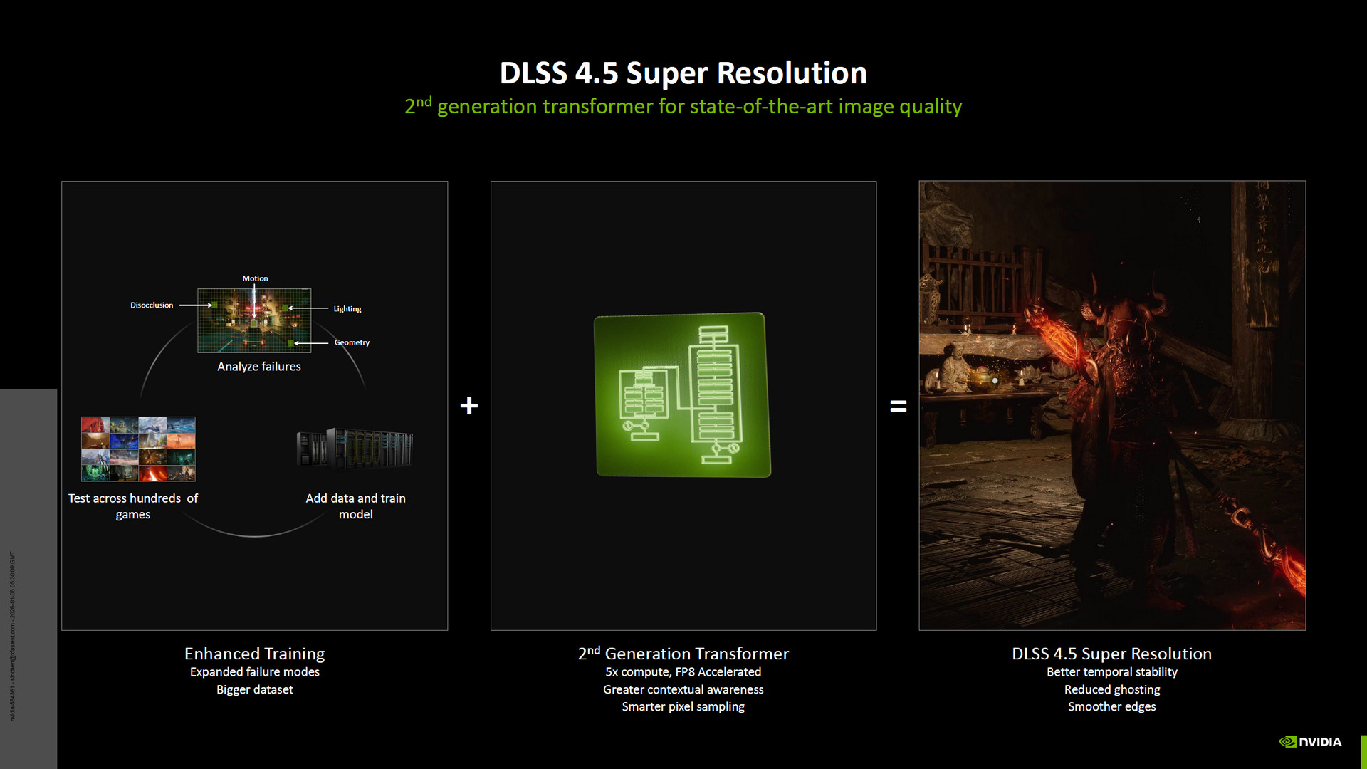 DLSS 4.5 帶來的超解析度 Super Resolution,採用第二代 Transformer 模型進行不斷的訓練遊戲影像,包含遊戲的運動向量、燈光、幾何等資料,隨後釋出第二代 Transformer 模型更新,這個更新適用於所有 RTX GPU,可通過 NVIDIA App Override 的方式,強制 DLSS 遊戲使用最新的模型。