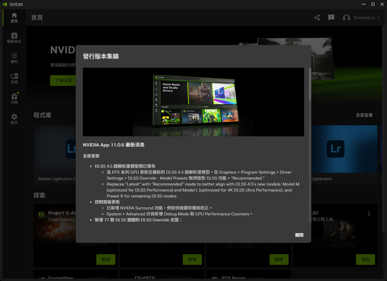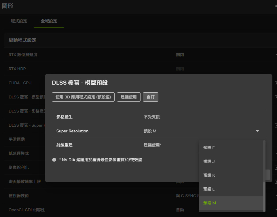 開啟 NVIDIA App,在圖形設定頁面中可針對單一遊戲、應用或者是「全域設定」套用這覆寫功能。接著選擇「DLSS 覆寫 – 模型預設」,選擇 Super Resolution 的預設模型即可,預設會選擇「建議使用」取代之前的最新選項,而保留建議使用即可啟用最新的 DLSS 4.5 兩個新模型(M、L)。