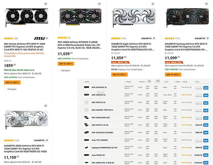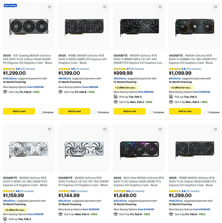 於Best Buy等主流商城中,多款非公版RTX 5070 Ti售價已漲至1000-1300美元間,而RTX 5080建議售價則為999美元。