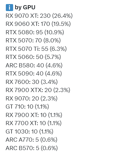 AMD RDNA 4架構顯示卡延續統治地位,RX 9070 XT已蟬聯銷售冠軍許久,RX 9060 XT則緊隨其後,其中16GB記憶體版本相較8GB更受青睞。