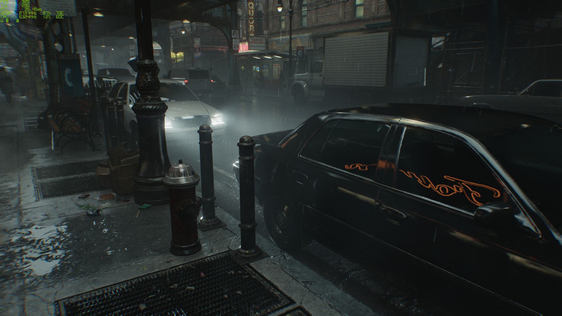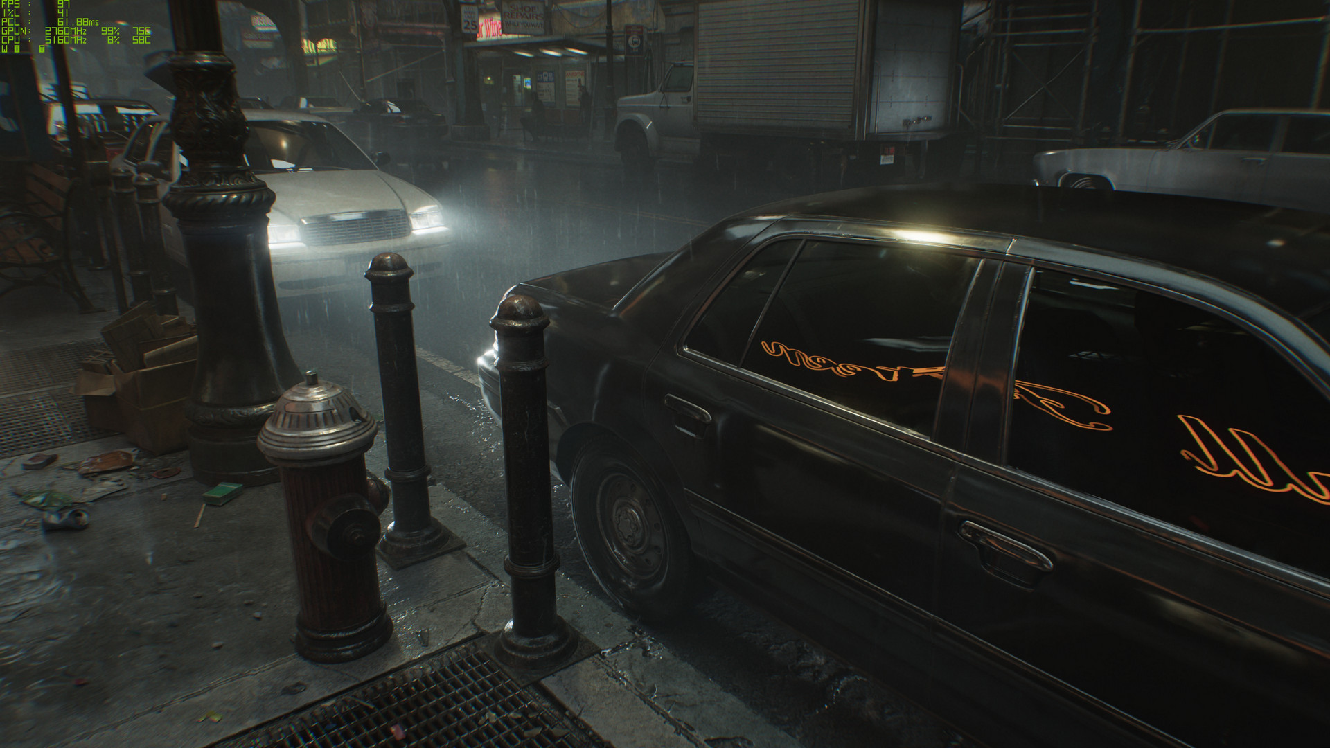 觀察黑車的車體細節,以及後方白車的車燈,還有消防栓的細節呈現,即可明顯感受到「路徑追蹤」所帶來的精湛畫質呈現。