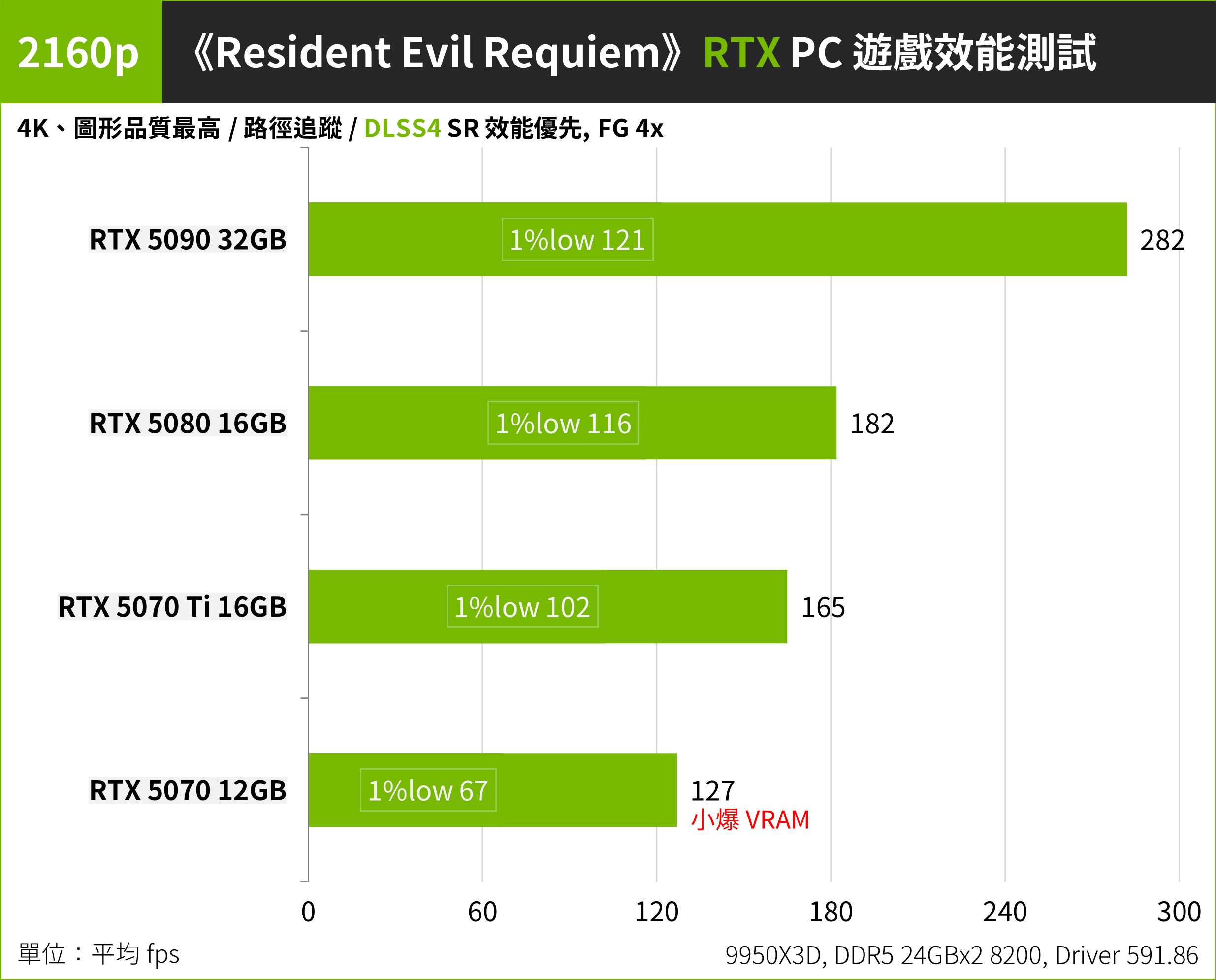 但從測試與體驗來看,RTX 5070 雖可做為 4K 入門的選擇,但必須降低一些特效避免遊戲超過 12GB VRAM 使用量,導致 1%Low 過低等不順暢的狀況發生。