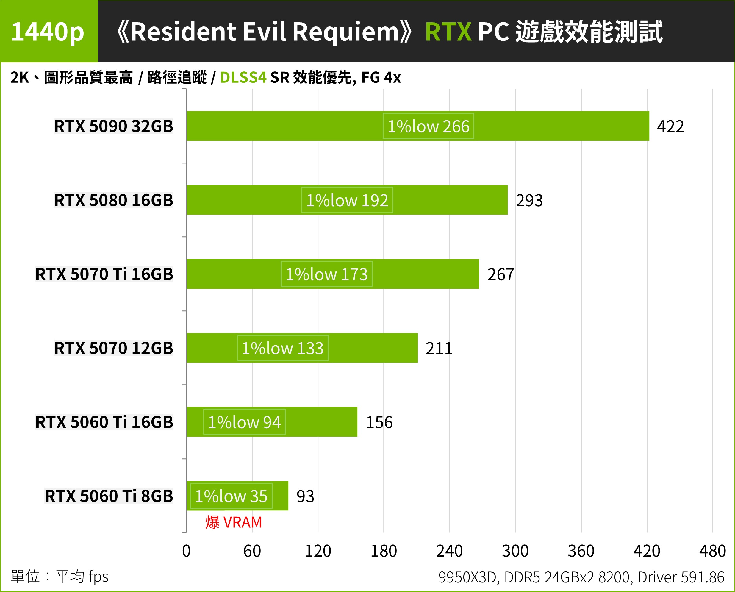 主流的 1440p、2K 解析度,設定維持不變的情況下。RTX 5060 Ti 16GB 可有著平均 156 FPS、1%Low 94 FPS 的表現。但是在這張之下 RTX 5060 Ti 8GB 開始,都必須降低畫質設定或者退至一般光線追蹤,才能有著順暢的遊戲體驗。
