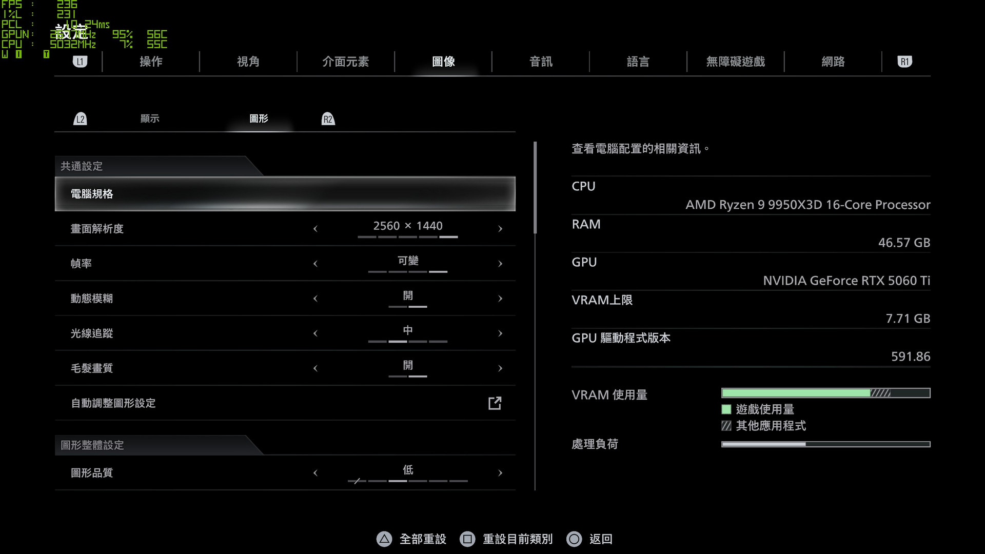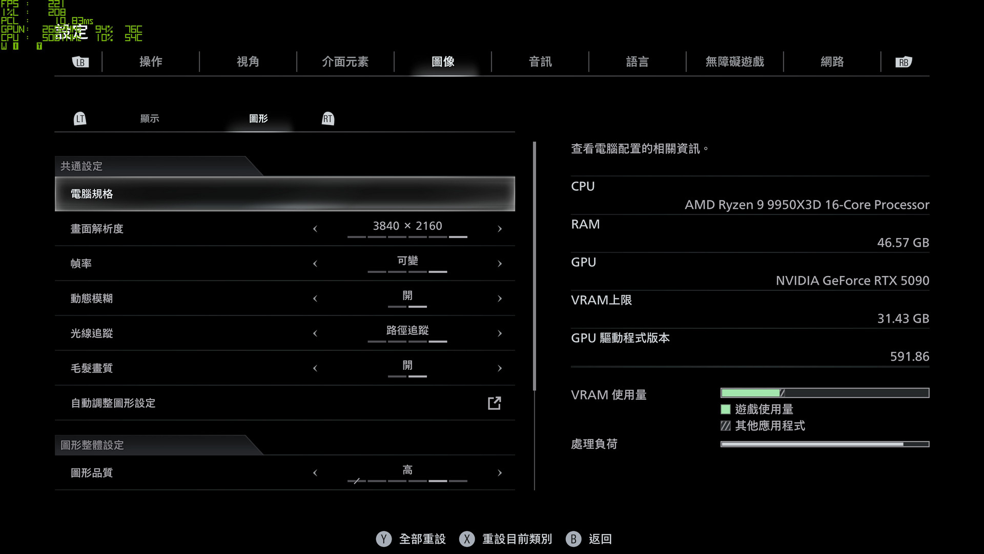 圖形設定中可調整畫面解析度、幀率、光線追蹤、毛髮畫質,而圖形品質則有提供多個不同等級的選項。光線追蹤除了路徑追蹤外,也提供一般光線追蹤與關閉的選項。