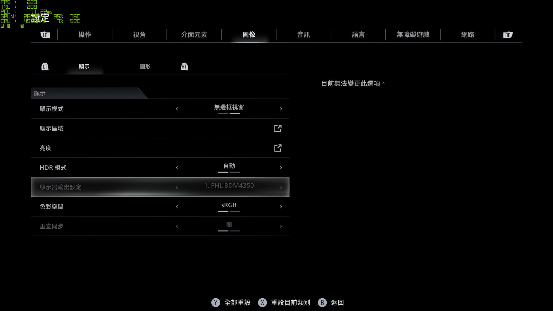 遊戲圖像設定中顯示預設採「無邊框視窗」,並有著顯示區域、亮度、HDR 與色彩空間等設定。