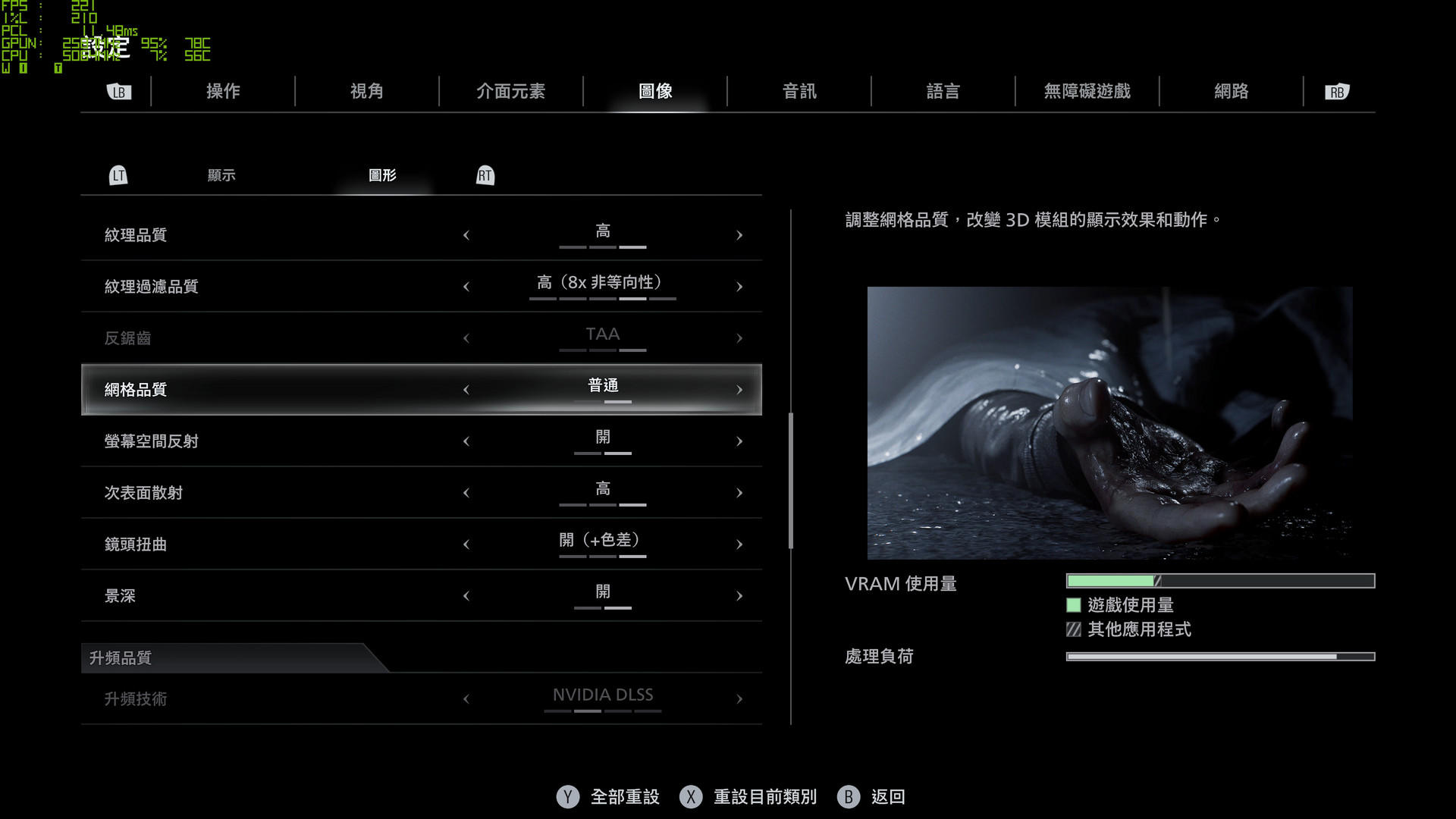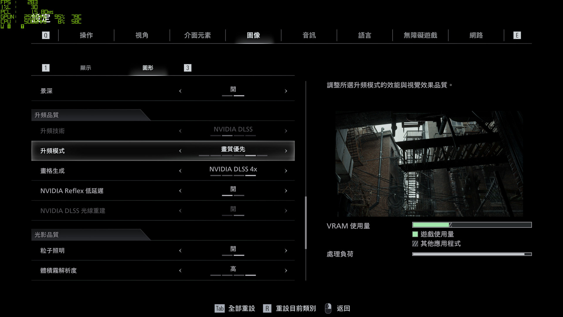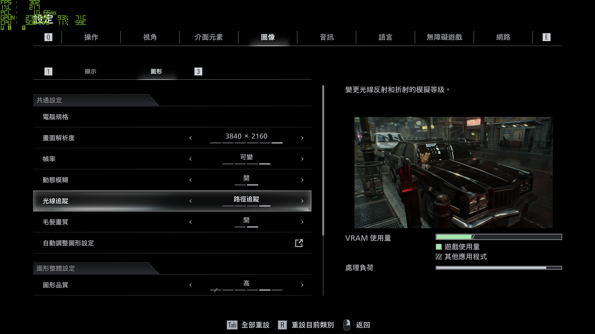 基本上 8GB VRAM 的顯示卡,設定上建議光線追蹤「中」、圖形品質「低」的設定,才能確保遊戲不會超過 VRAM 可使用量的狀況發生。