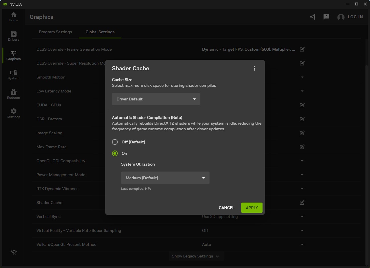 驅動預設將「Shader Cache」設定為關閉,玩家可在 NVIDIA App 繪圖 > 全域設定找到 Shader Cache 並啟用,並可設定快取大小與自動更新快取。