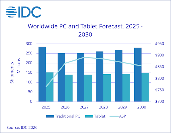 雖然出貨量下滑,但由於平均售價(ASP)提升,PC市場2026年將成長1.6%,達到2740億美元,而平板電腦亦將成長3.9%,達到668億美元。