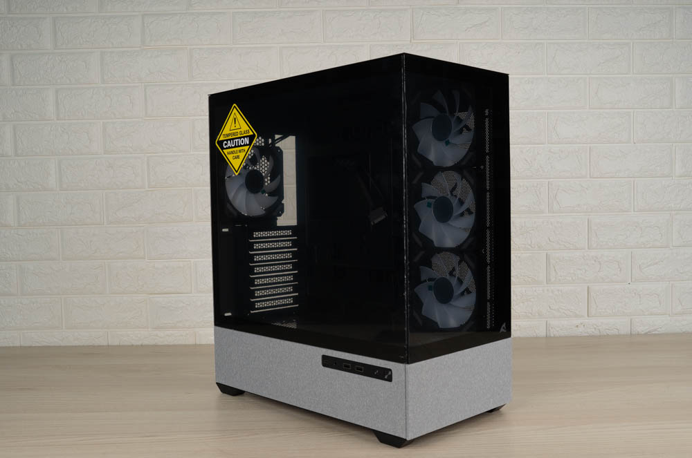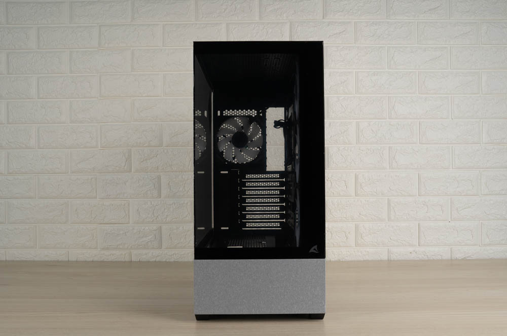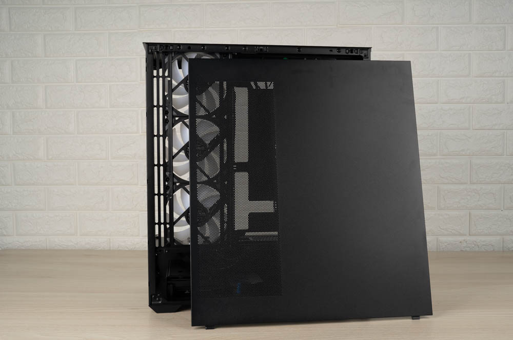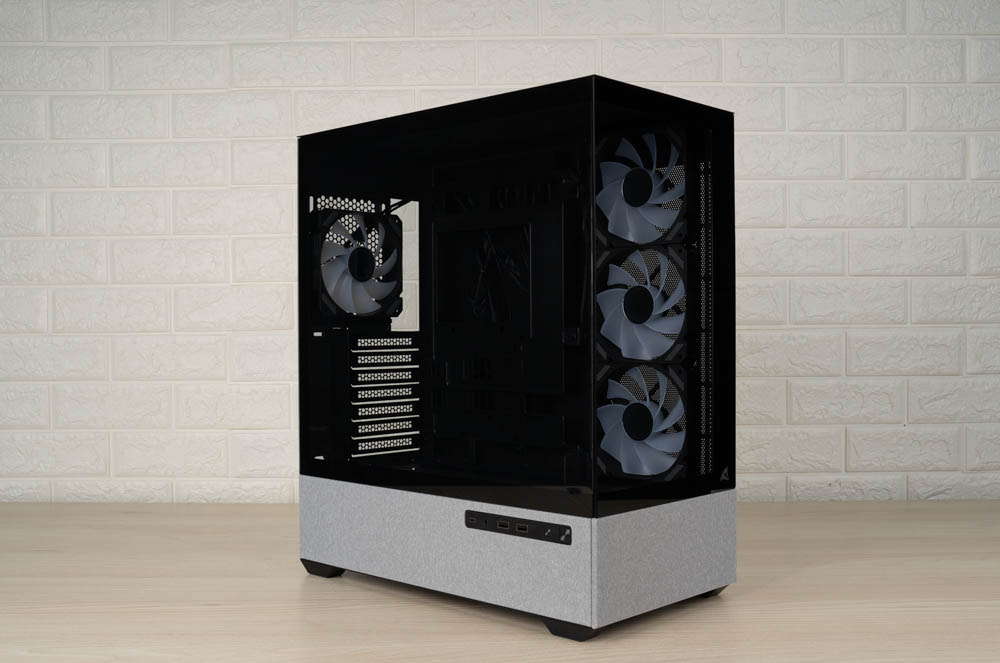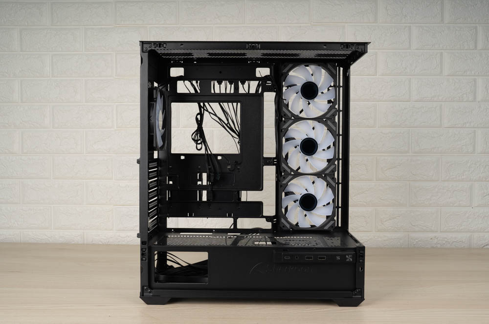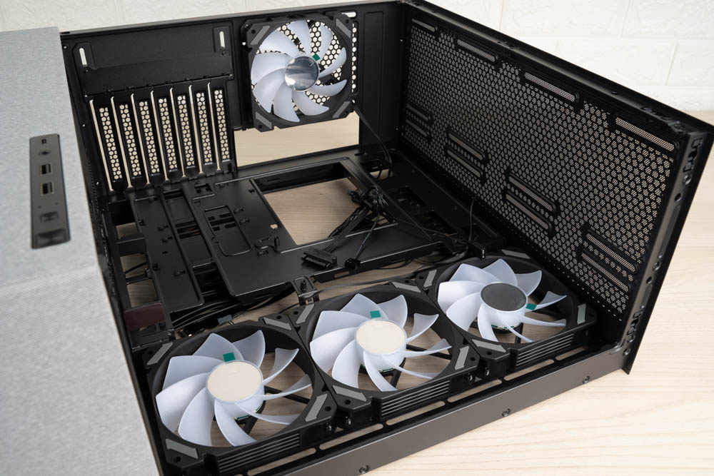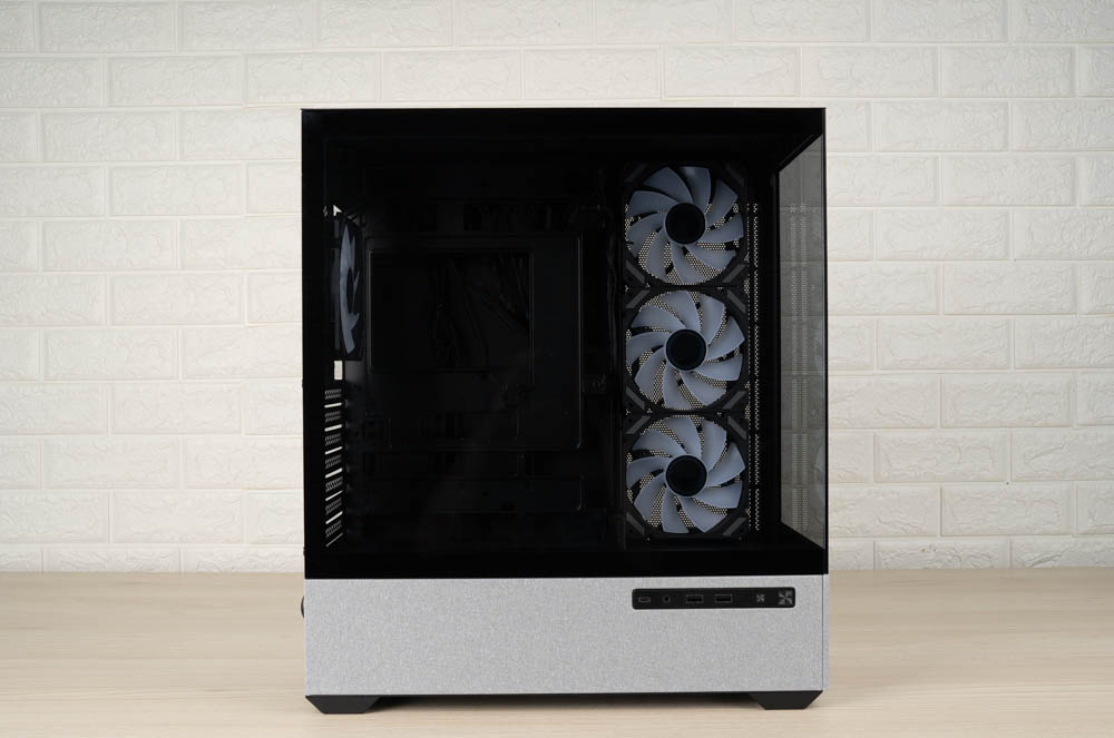 機殼側邊預裝三顆 120mm ARGB 反葉進風扇,頂部則採網孔設計,並將風扇安裝位向左側偏移,加上內部挑高結構,大幅降低水冷排與主機板散熱模組的干涉問題。後方同樣內建一顆 120mm 正向 ARGB 風扇,加強排風效率。