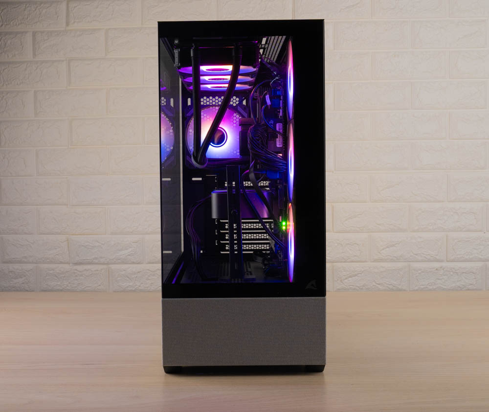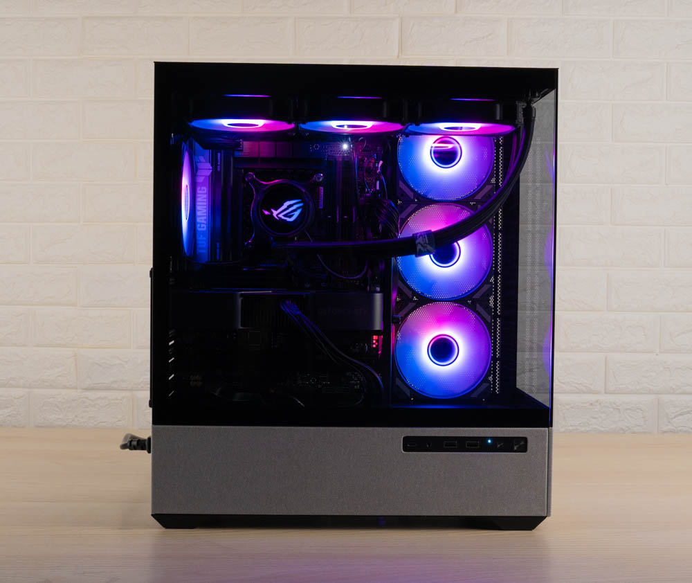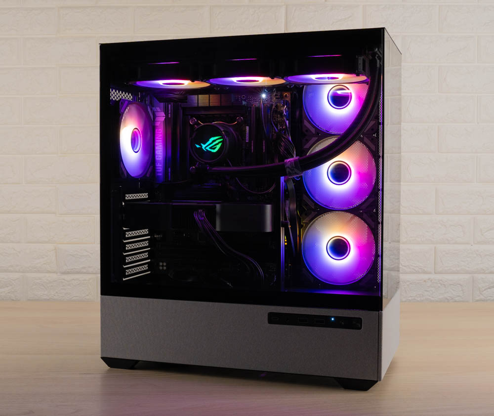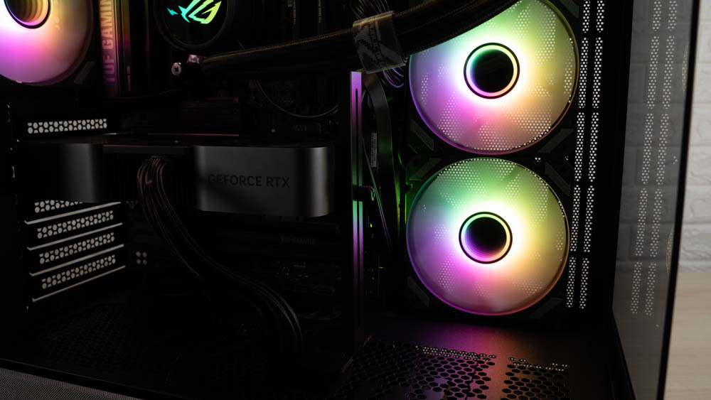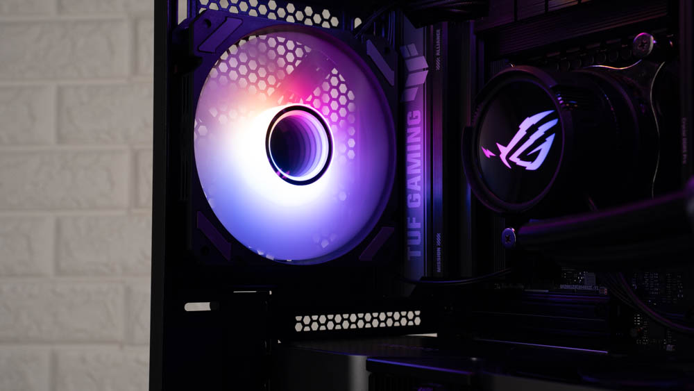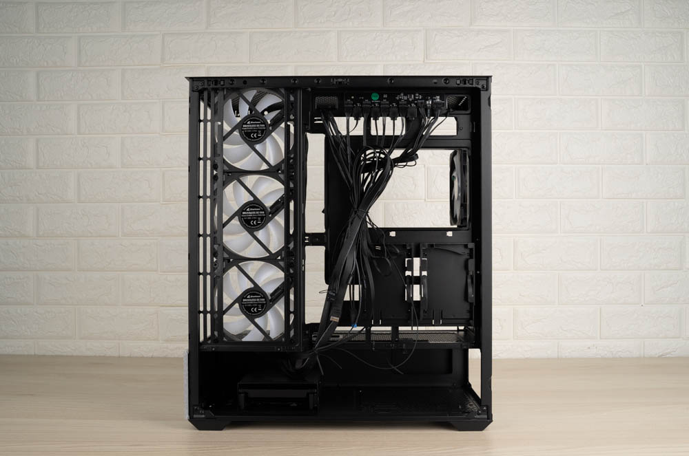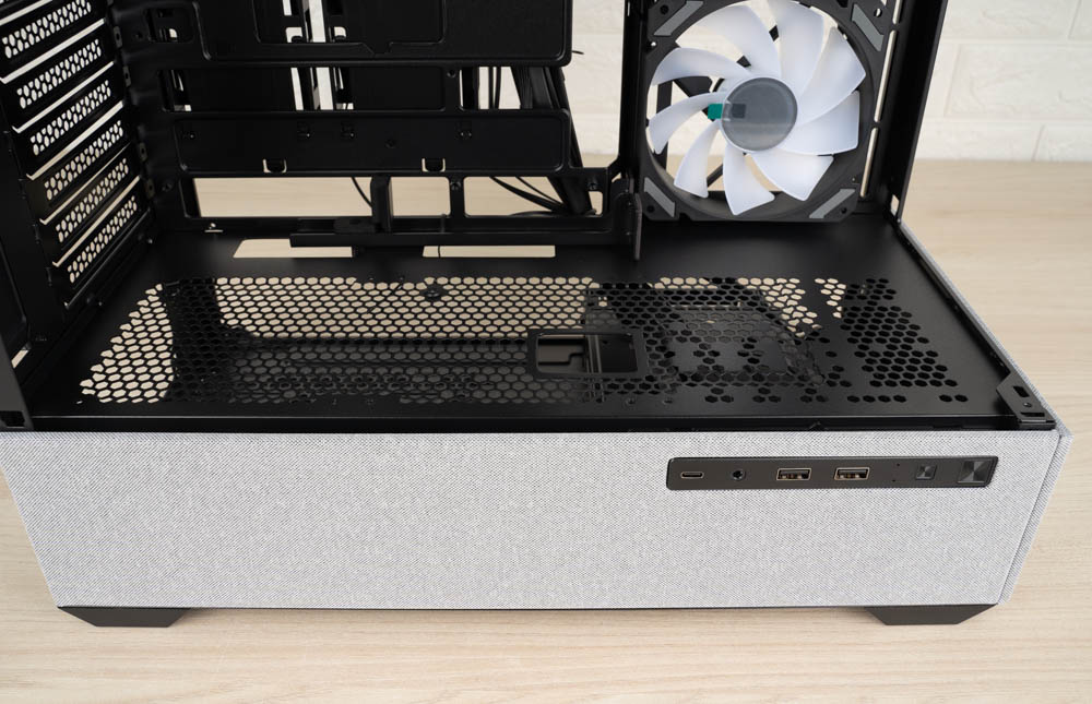 機殼側邊預裝三顆 120mm ARGB 反葉進風扇,頂部則採網孔設計,並將風扇安裝位向左側偏移,加上內部挑高結構,大幅降低水冷排與主機板散熱模組的干涉問題。後方同樣內建一顆 120mm 正向 ARGB 風扇,加強排風效率。