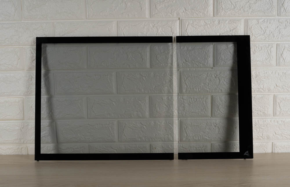 ↑ 兩塊玻璃雙面皆有保護膜,左側玻璃板有玻璃注意的警告標示。