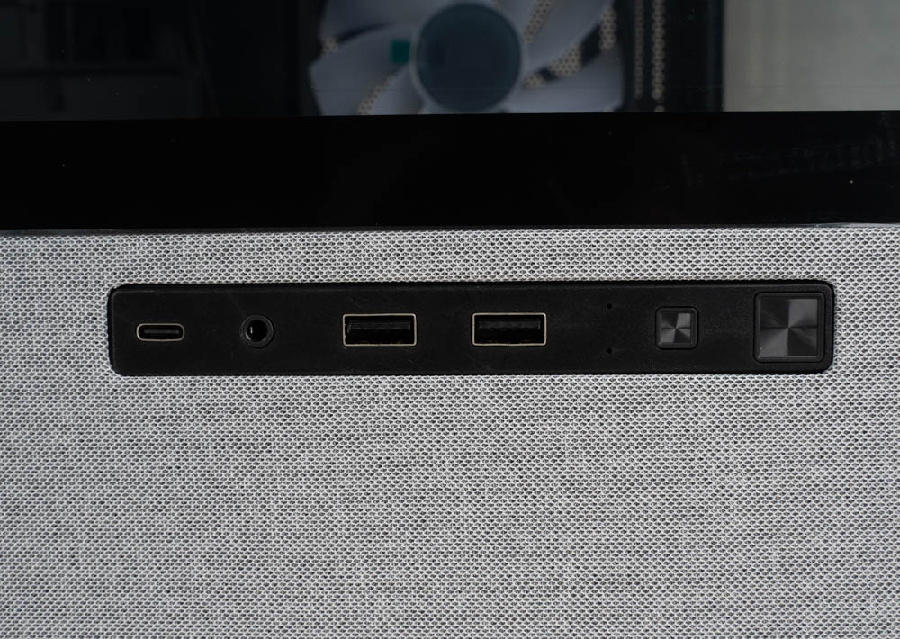I/O 提供1個 USB 3.2 Gen2 Type-C、2個USB 3.1 Gen1 Type-A、1個3.5mm 音源孔、1個 POWER 鍵與1個LED 燈效鍵。設計於機殼左側,方便連接裝置,也能減少家中寵物誤觸按鈕的情況。