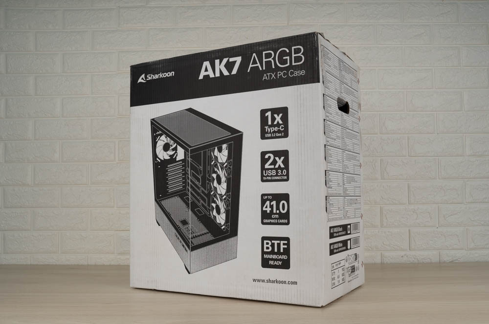 簡單的黑白包裝設計,封面有巨大 Sharkoon AK7 ARGB 字樣與機殼簡圖,標示機殼主要特色,如支援 BTF 背插主板、顯卡長度上限 41cm,以及 I/O 提供 USB 3.2 Gen2 Type-C、USB 3.2 Gen1 Type-A 。