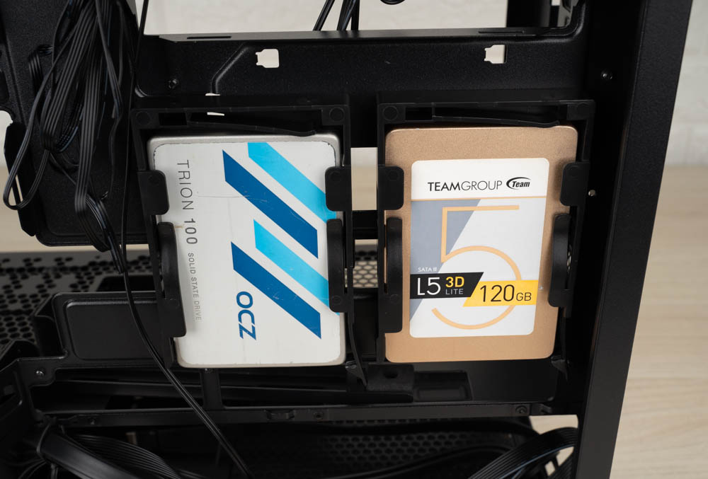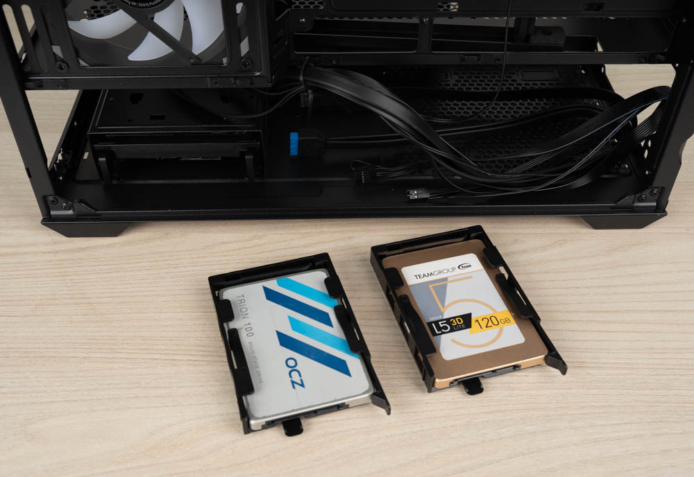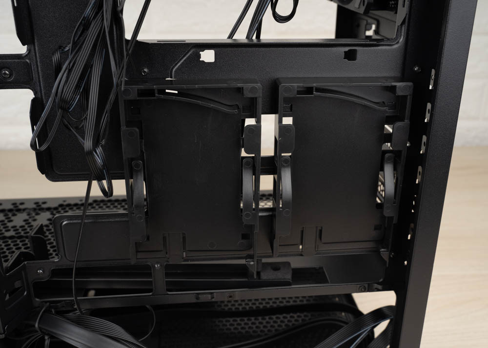 機殼右側的內部理線空間深度約為33 mm,空間還算足夠,隨附的配件包與 ARGB 風扇控制器都可整齊安置於此,方便玩家安裝與管理。硬碟架採三處快拆式設計,共可安裝兩顆 3.5 吋硬碟或四顆 2.5 吋硬碟,不僅提升擴充彈性,也讓拆裝與維護變得更加便利。