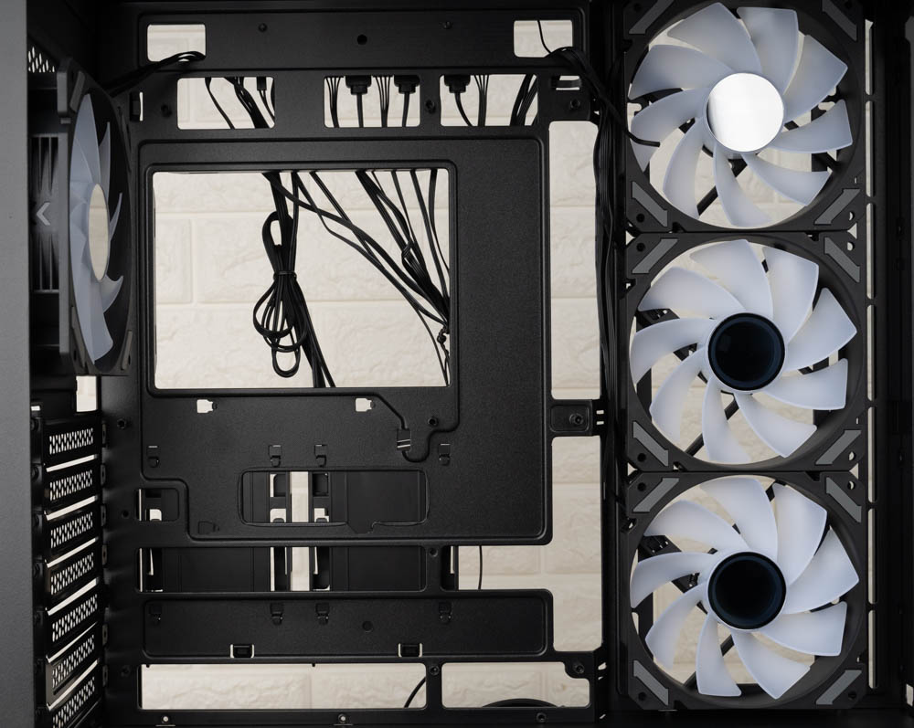機殼內部支援 ATX 向下相容的各類主機板,包括 ATX 背插主機板。頂部設計有挑高結構,以提升水冷排的安裝相容性;底部則配合背插板設計,擴大內部空間,方便走線與硬體安裝。散熱方面,氣流主要由側邊引入新鮮空氣,再由頂部與後方排出廢熱,使整體氣流暢通無阻,確保各硬體在高負載下仍能維持穩定溫度。