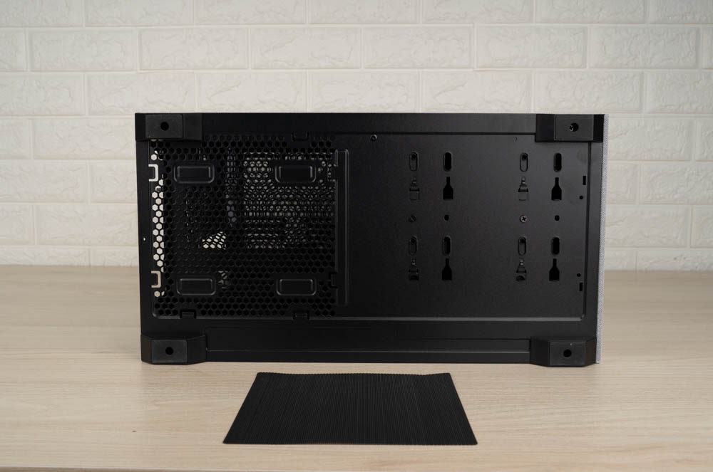 最後來到機殼底部,前方可以看到快拆硬碟架的鎖定機構,後方則是留給電源供應器的進氣口,並設有卡準式的防塵網。同時機殼四腳皆有架高協助散熱。
