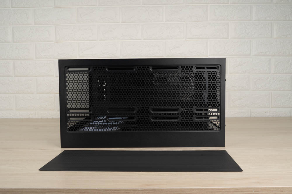 主角登場,尺寸435 x 225 x 485 mm,因為沒有前後雙艙體設計,相對寬度就能縮減很多,機殼看上去也不會這麼大了。側邊內建風扇並在右側板開孔透氣,I/O在左側也是相當特別。