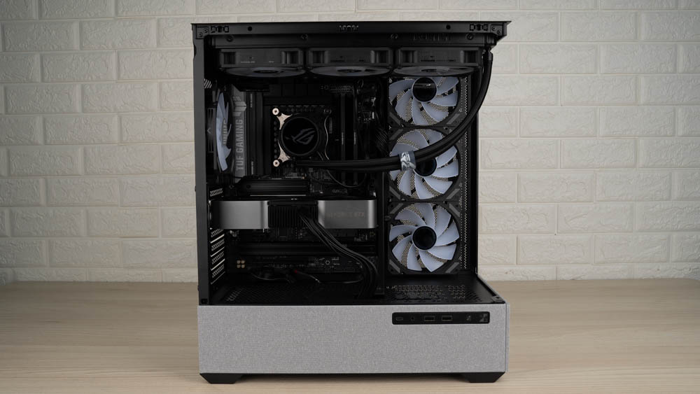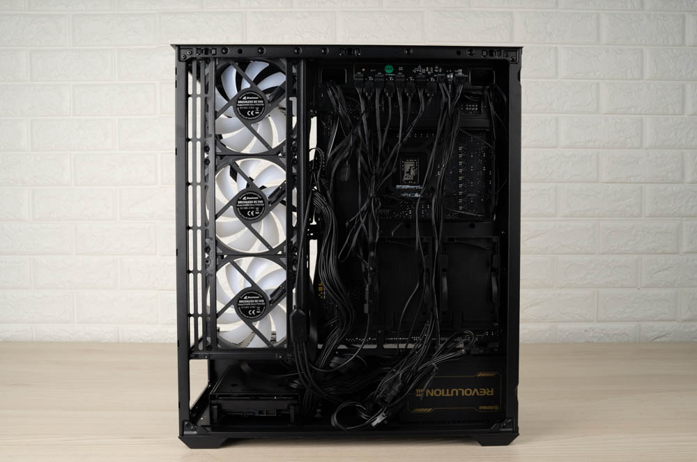 ↑ 放入主機板與 360 水冷後,圖中可見內部仍留有充裕空間,能減少水冷排或線材與主板之間的干擾。