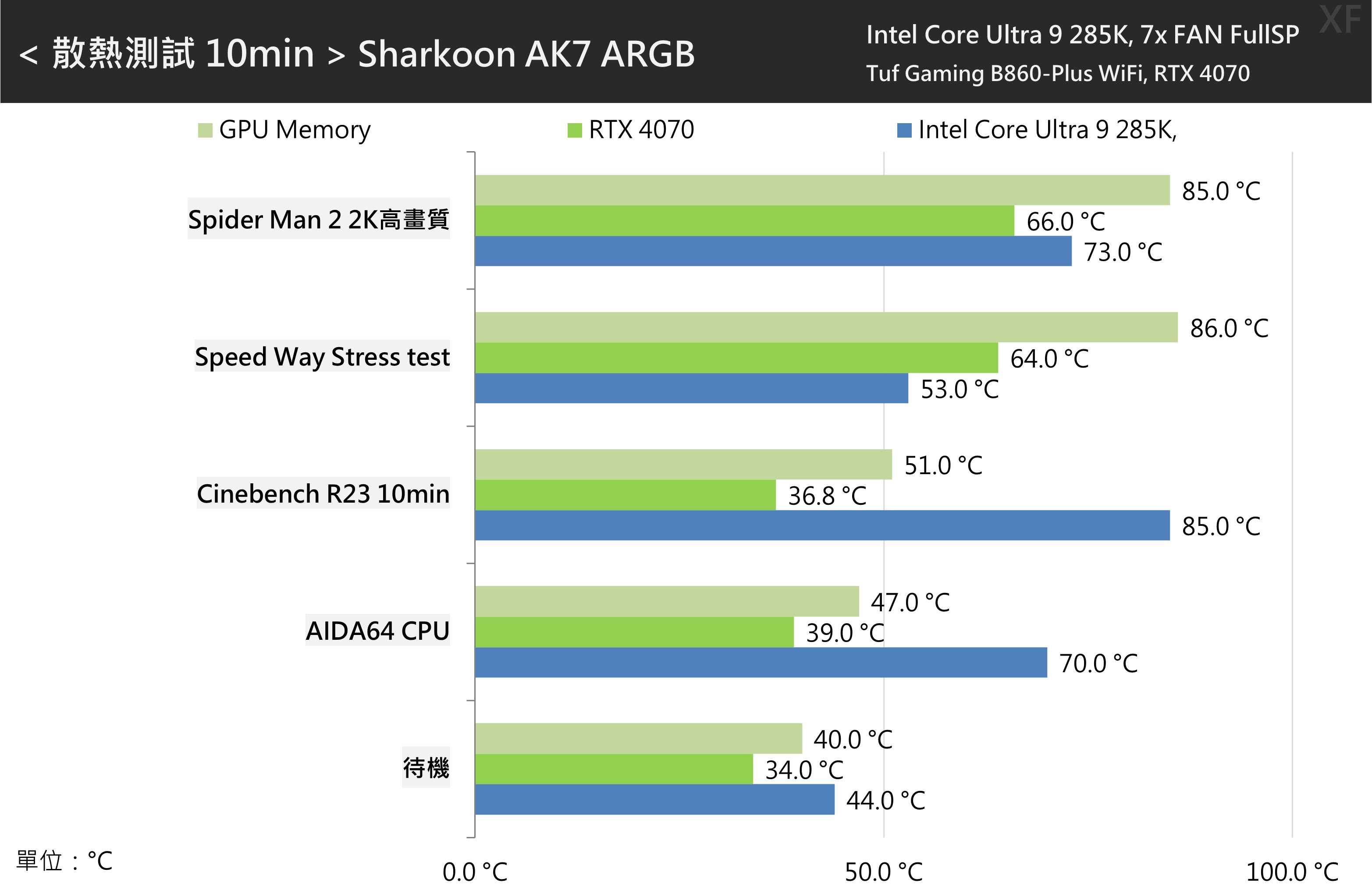 測試使用了 Intel Core Ultra 9 285k 處理器搭配前面安裝搭配使用的 ASUS TUF GAMING B860-PLUS WIFI 主機板,顯示卡則是公版的 RTX 4070,在Windows 11的環境下測試,處理器使用預設設定並將風扇調為全速,並使用HWiNFO紀錄十分鐘的平均溫度。