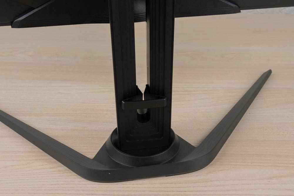 AORUS FO27Q5P 的底座設計稍大,採用穩定的 V 型結構,雖然會佔用部分桌面空間,但整體非常紮實,即使在調整螢幕角度時,也能保持良好的平衡感。底座支援高度、傾斜、旋轉與垂直多向調整,不論是直立瀏覽文件、橫向遊玩遊戲,或依照個人坐姿微調角度,都能輕鬆找到最舒適的視角。
