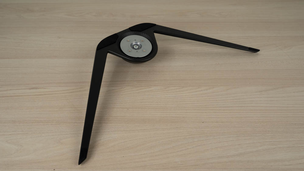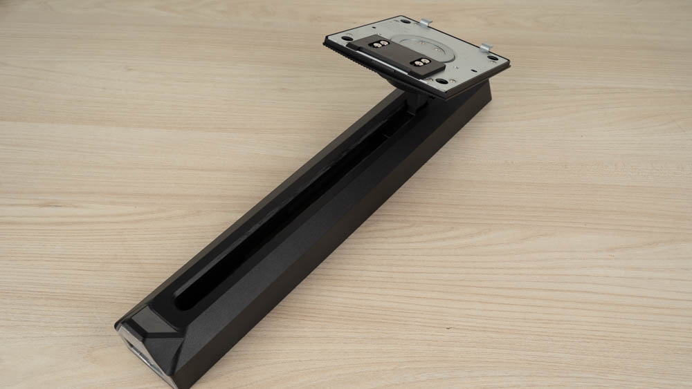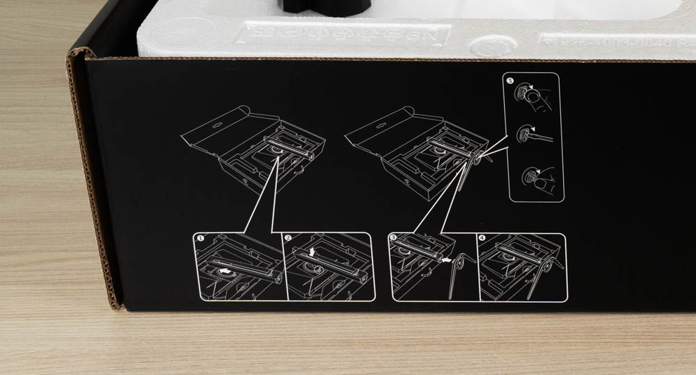 打開外盒,先取出上層的配件包含底座、支架、變壓器、配件包等。這時千萬不要直接把螢幕抱起來,因為 OLED 面板非常薄若施力點不對可能會造成面板損傷,正確的取出螢幕方式是,先將螢幕支架固定在螢幕背面,接著鎖上螢幕支架的底座,最後握著支架將螢幕抬起。
