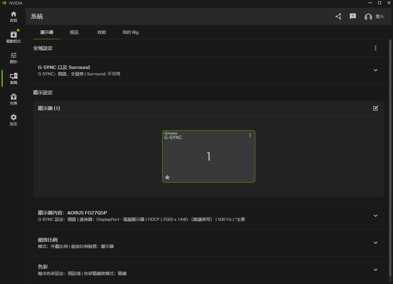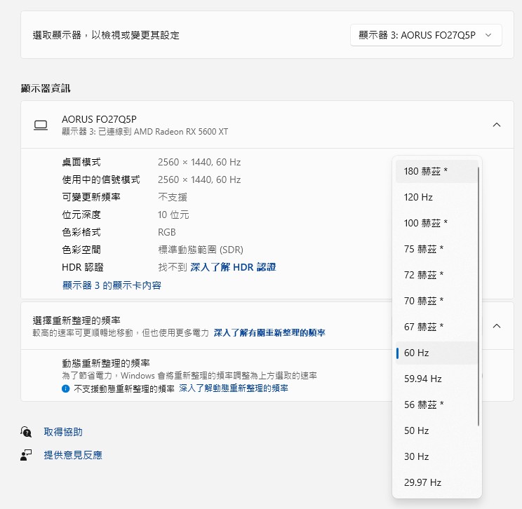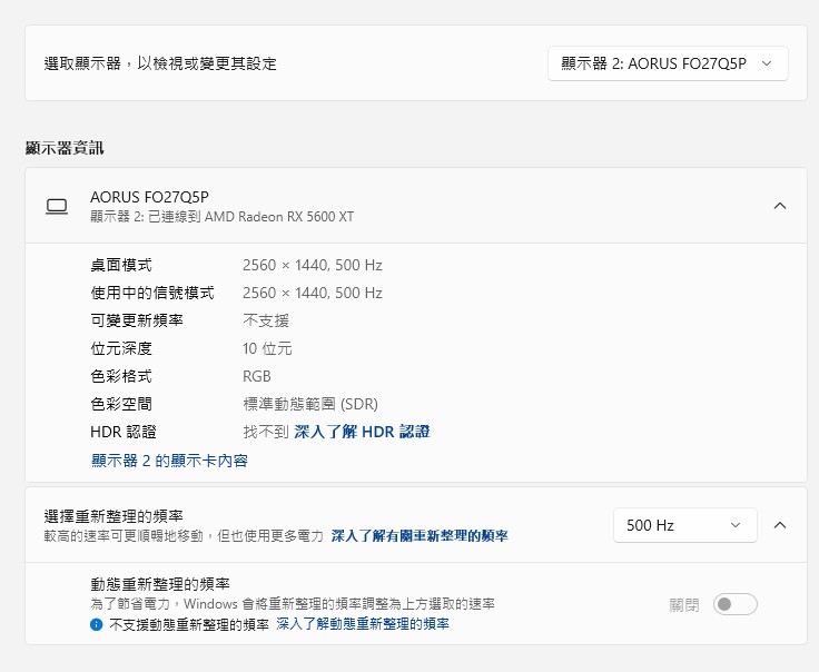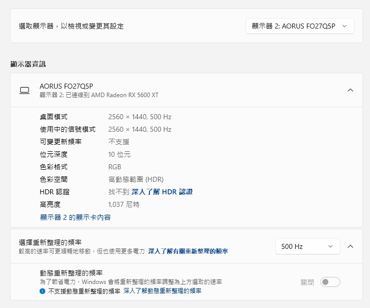 ↑ FO27Q5P 點亮 2560 x 1440、10-bit、RGB、SDR、500Hz 的規格。