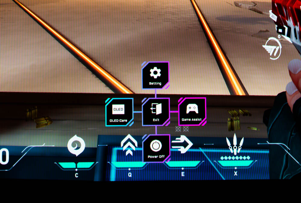 接著是設定的部分,螢幕正下方的控制按鈕按下去,有提供五個快捷按鈕,上方為設定,左邊為 OLED Care、右邊是 Game Assist、下方是 Power OFF 、正中間是離開選單。