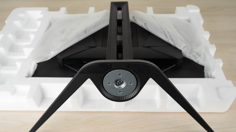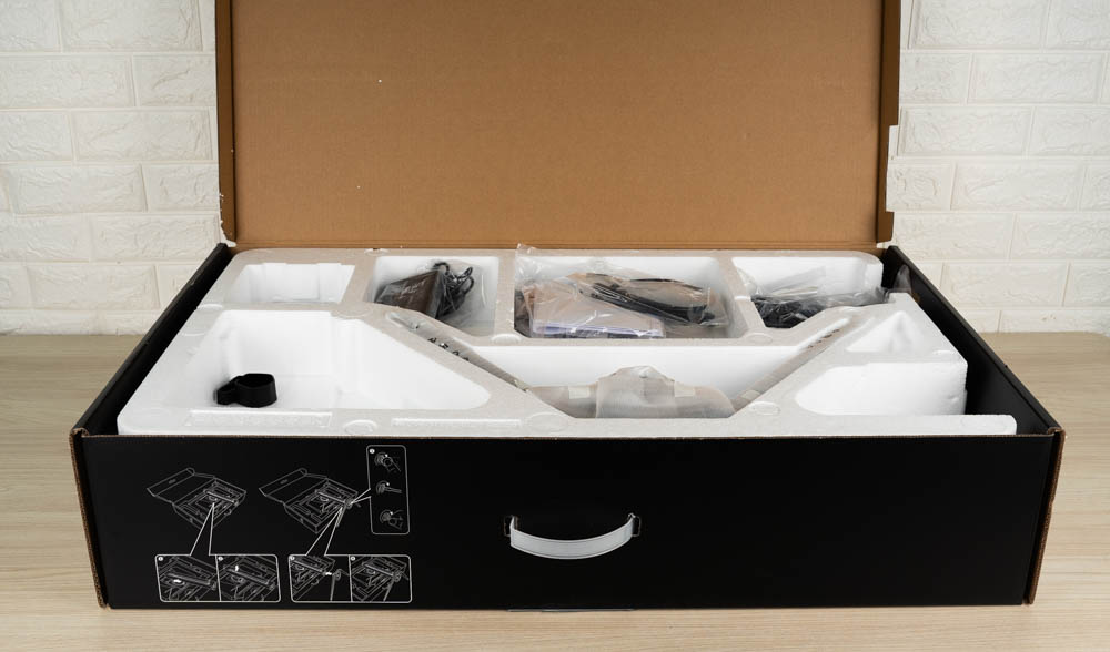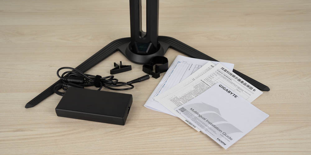 包裝箱裡面有安裝教學示意圖,玩家可以依照圖示步驟輕鬆完成底座與螢幕本體的組裝。打開包裝後,內部使用厚實的保麗龍固定結構將螢幕與配件穩固保護,整體包裝設計兼具美觀與實用,讓人在開箱時就能感受到技嘉對產品細節的用心。