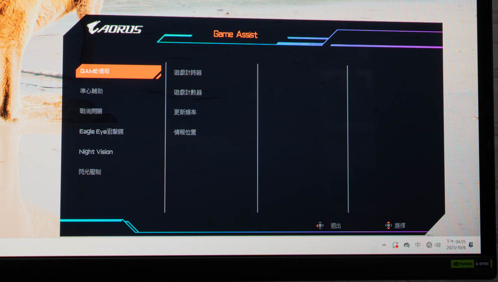 作為電競螢幕,遊戲輔助功能自然不可或缺,但實用性還是較看個人。這款螢幕提供多種選項,包括 GAME 情報、準心輔助、戰術開關(可一鍵切換 24/27 吋螢幕及多種解析度:2560×1440 16:9、1920×1080 16:9、1280×960 4:3、1024×768 4:3、1280×1024 5:4)、Eagle Eye 狙擊鏡、Night Vision 夜視鏡,以及 閃光壓制等功能。