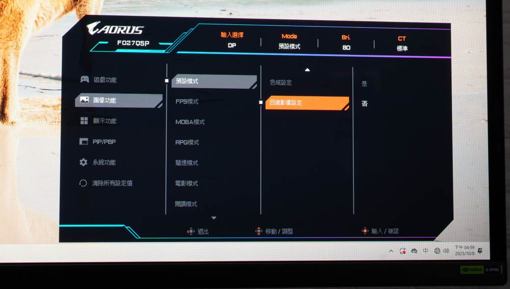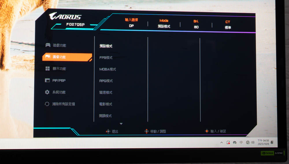 ↑ 圖像功能有許多模式可以選擇,小編較常使用FPS模式與sRGB模式。