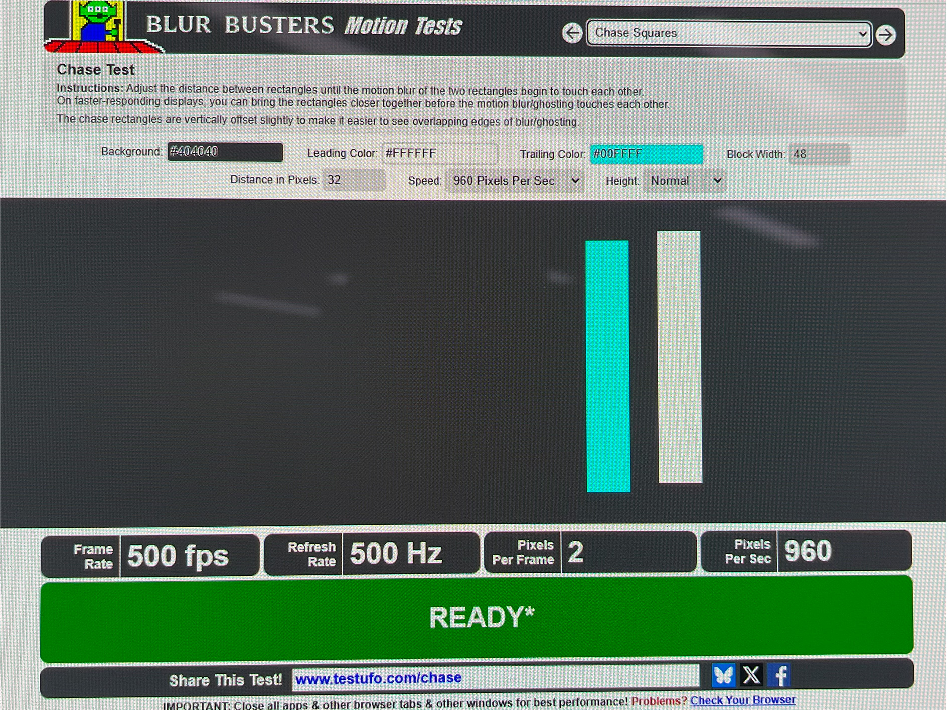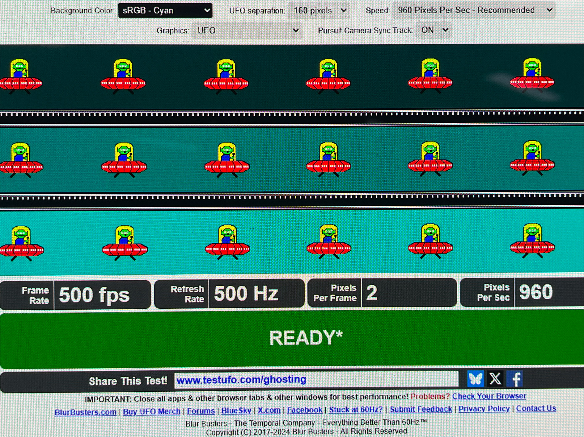 最後通過 UFO Test 進行人眼檢查,可見飛碟的移動相當清晰、方塊的右邊與左邊線條也相當完整,沒有過慢的殘影或者過快的疑慮。