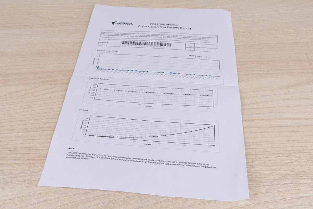 ↑ 理線夾、保固卡、快速使用指南、色彩校準測試報告,還有變壓器。