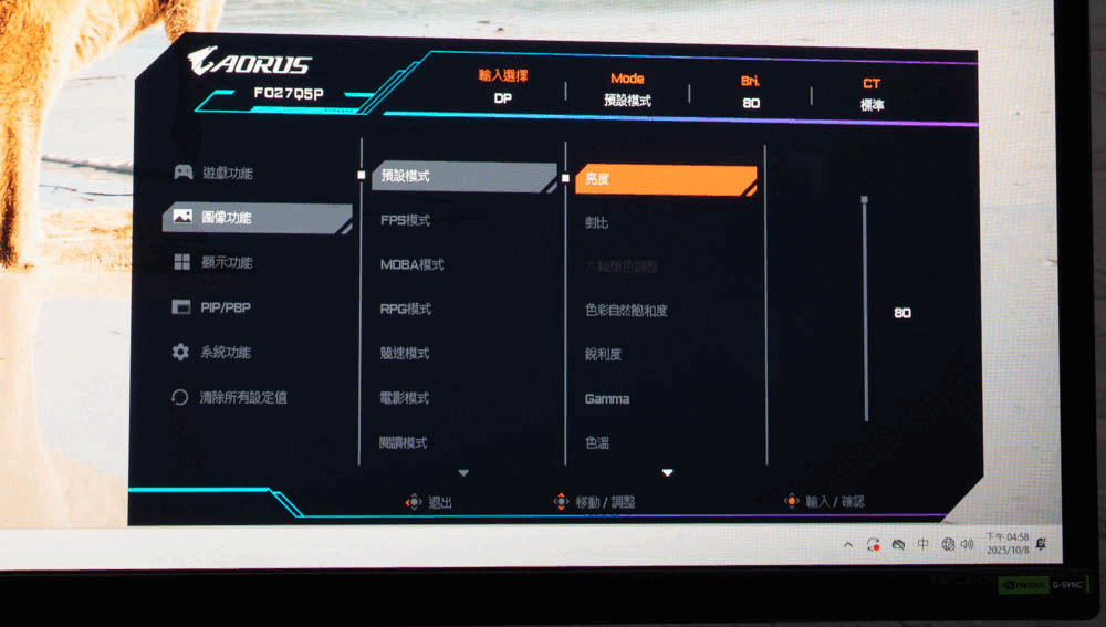 在影像表現方面,FO27Q5P 預設模式下,亮度為 80、對比度 50、色溫設定為標準、Gamma 為 2.2,就能呈現準確且自然的畫面,無需額外微調即可享受出色的視覺體驗。